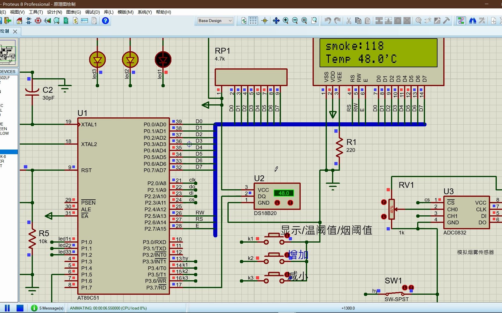 基于51单片机火灾报警器(温度、火焰、烟雾,可调节阈值、相应提示灯)