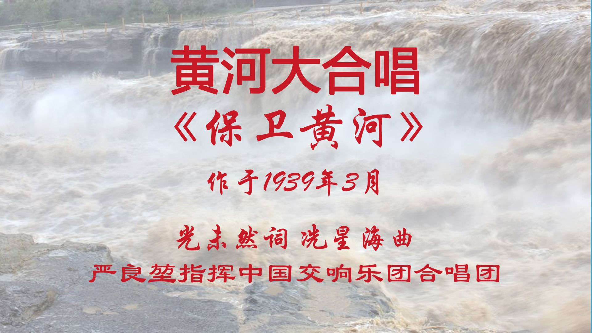 黄河大合唱 - 作于1939年3月 光未然词 冼星海曲 严良堃指挥中国交响乐团合唱团 全曲由《黄河船夫曲》、《黄河颂》、《黄河之水天上来》(配乐诗朗诵)、《黄水谣》、《河...