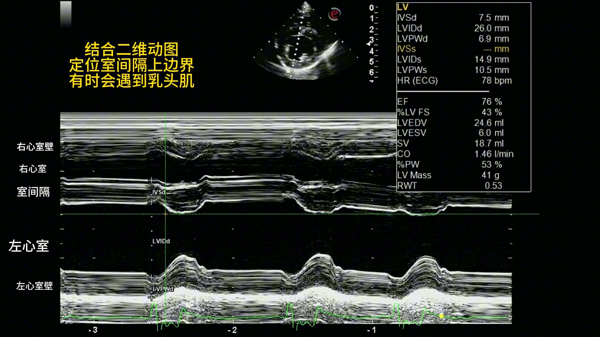 犬左心室M超测量。心脏超声。小动物心脏超声,