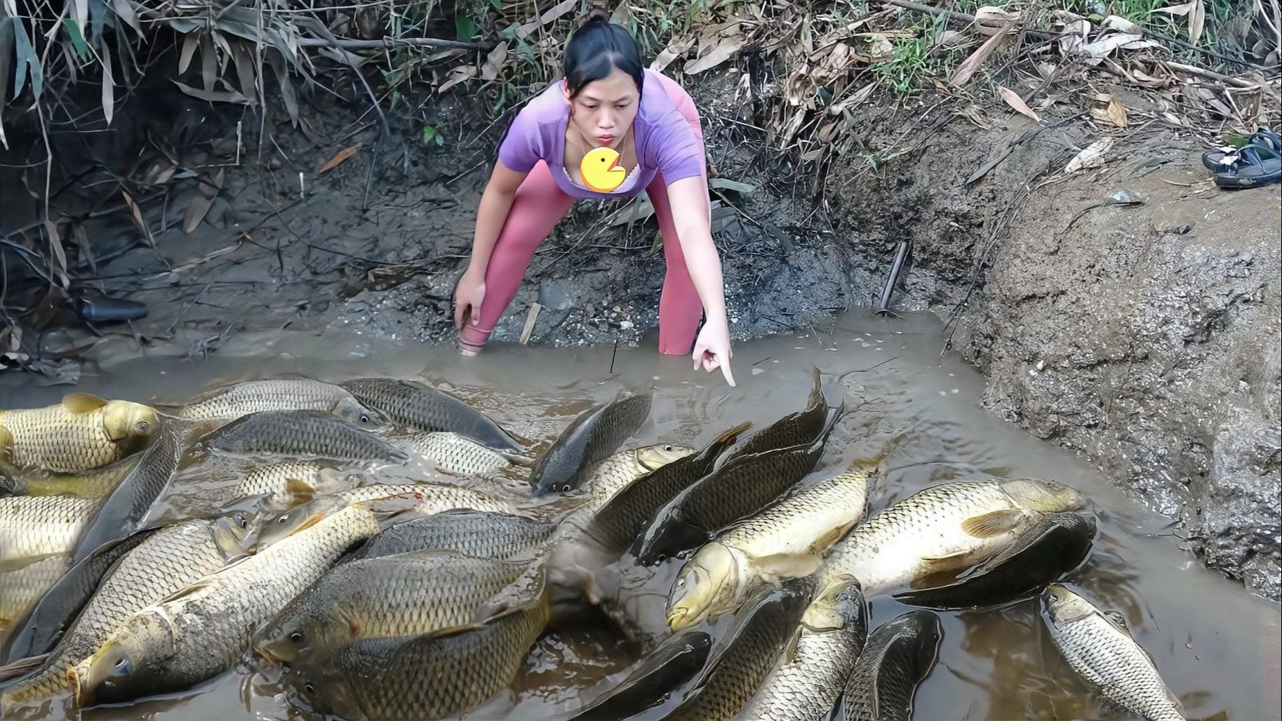 越南河边小妹抓鱼,抽水坑抽干河边老水坑,两小时抓鱼爆桶