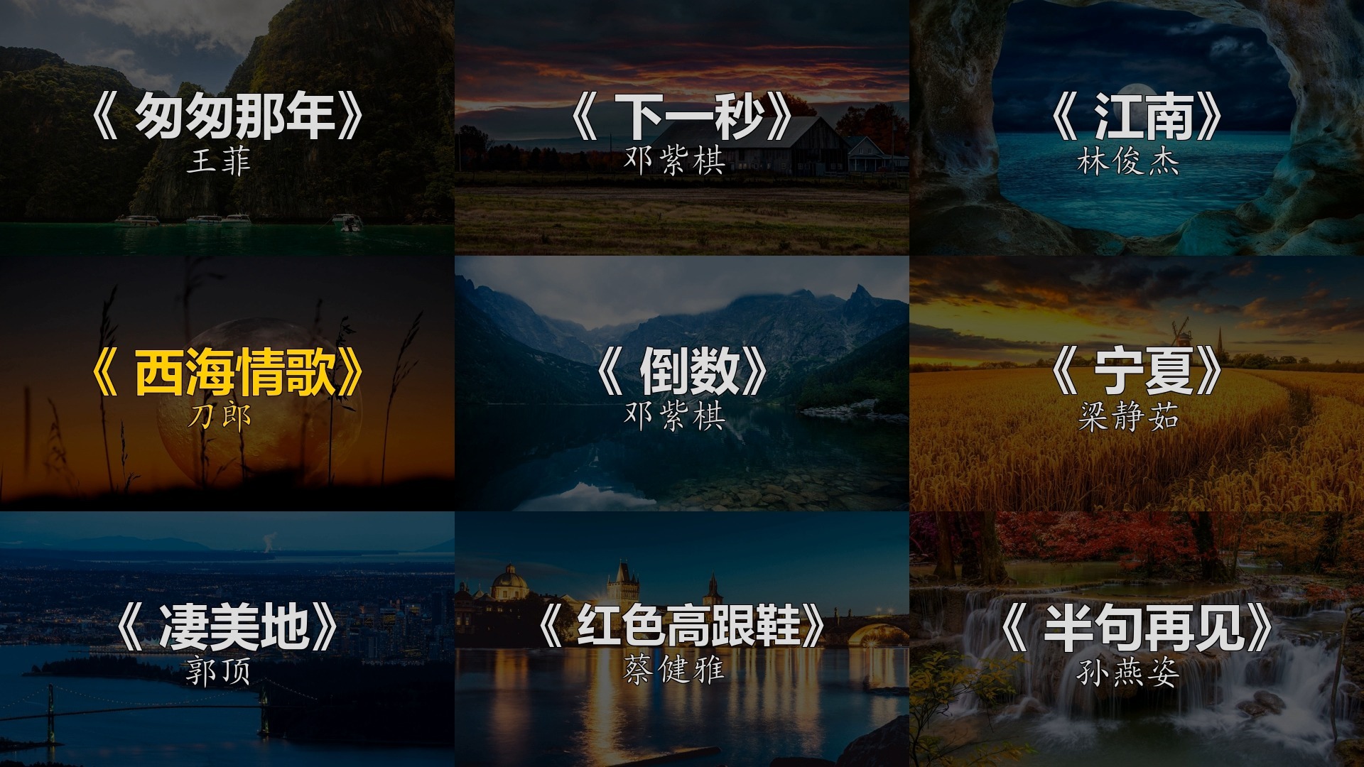 热歌榜《 匆匆那年》《 下一秒》《 江南》《 西海情歌》《 倒数》《 宁夏》《 凄美地》《 红色高跟鞋》《 半句再见》
