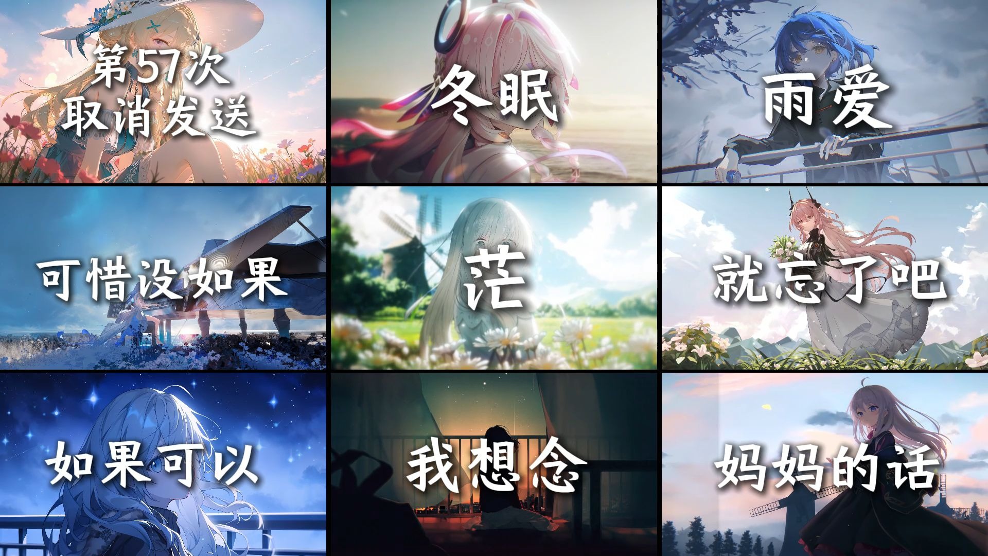 UP主: 封面: 简介:壁纸均来自wallpaper0:00-茫-塞西莉亚【安静】4:33-第57次取消发送-晨风温和,丰满茵足-菲比【4K】7:34-冬眠-茜特菈莉12:03-雨爱-山田凉16:24-可惜没有如果-鸣潮 守岸人 全...