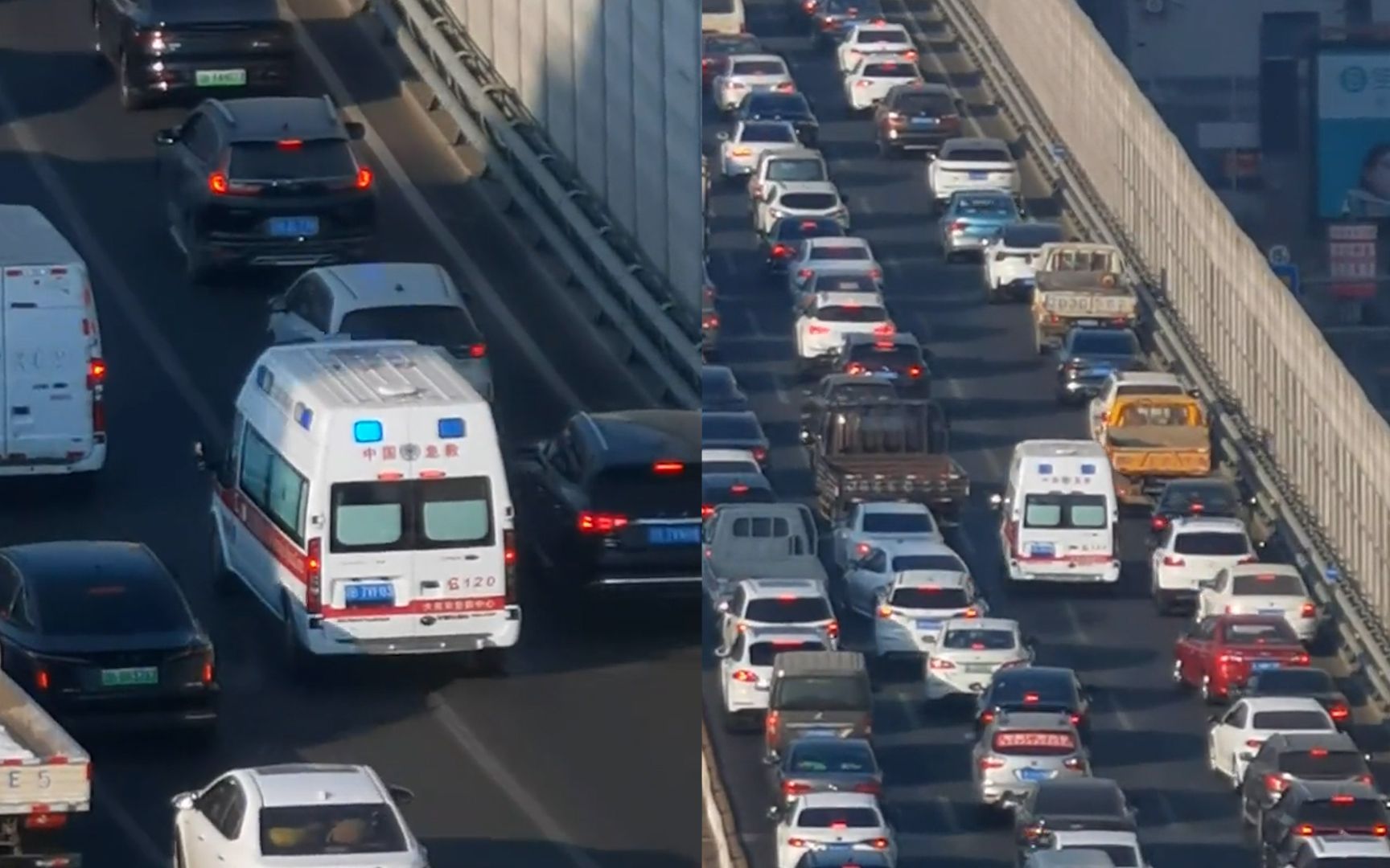 救护车救援遇晚高峰堵车,高架桥上数百车辆,主动避让为生命让行