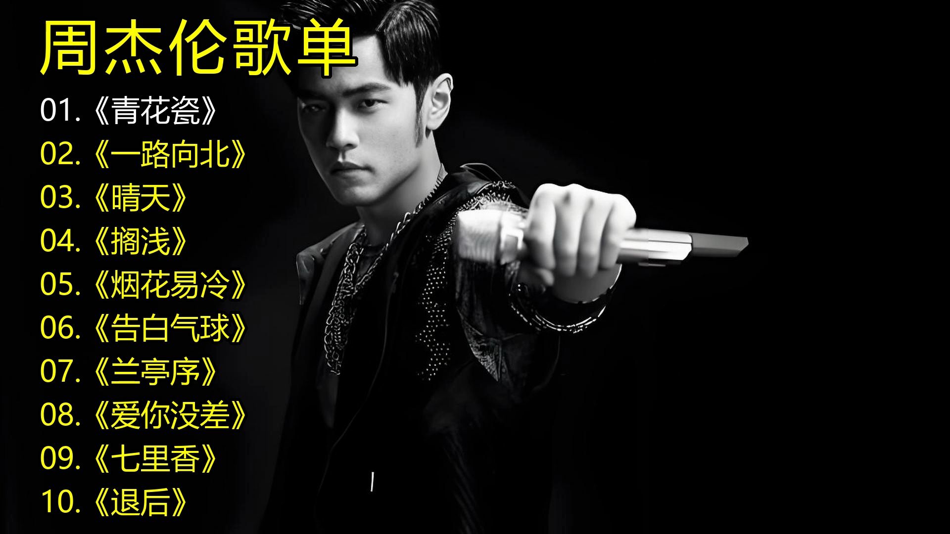 周杰伦歌单《青花瓷》《一路向北》《晴天》《搁浅》《烟花易冷》《告白气球》《兰亭序》《爱你没差》《七里香》《退后》 - 周杰伦歌单《青花瓷》《一路向北》《晴天》《搁浅》《烟花易冷》《告白气球》《兰亭序》《爱你没差》《七里香》《退后》