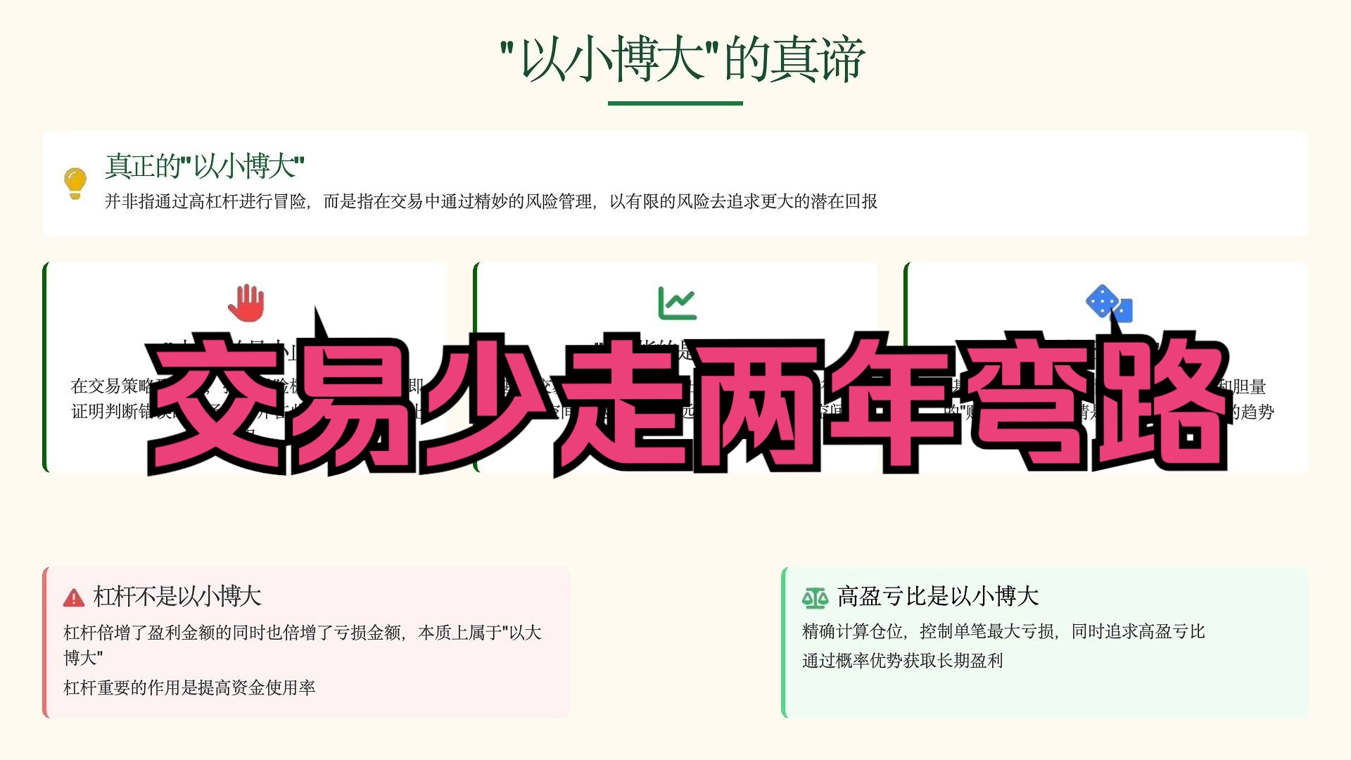 讲解了一些永续合约交易的非技术层面的分享。包括数学期望值、盈亏比、波段交易、剥头皮交易、杠杆的正确认识、什么是以小博大、常犯的两种错误、仓位管理、仓位计算、自动...