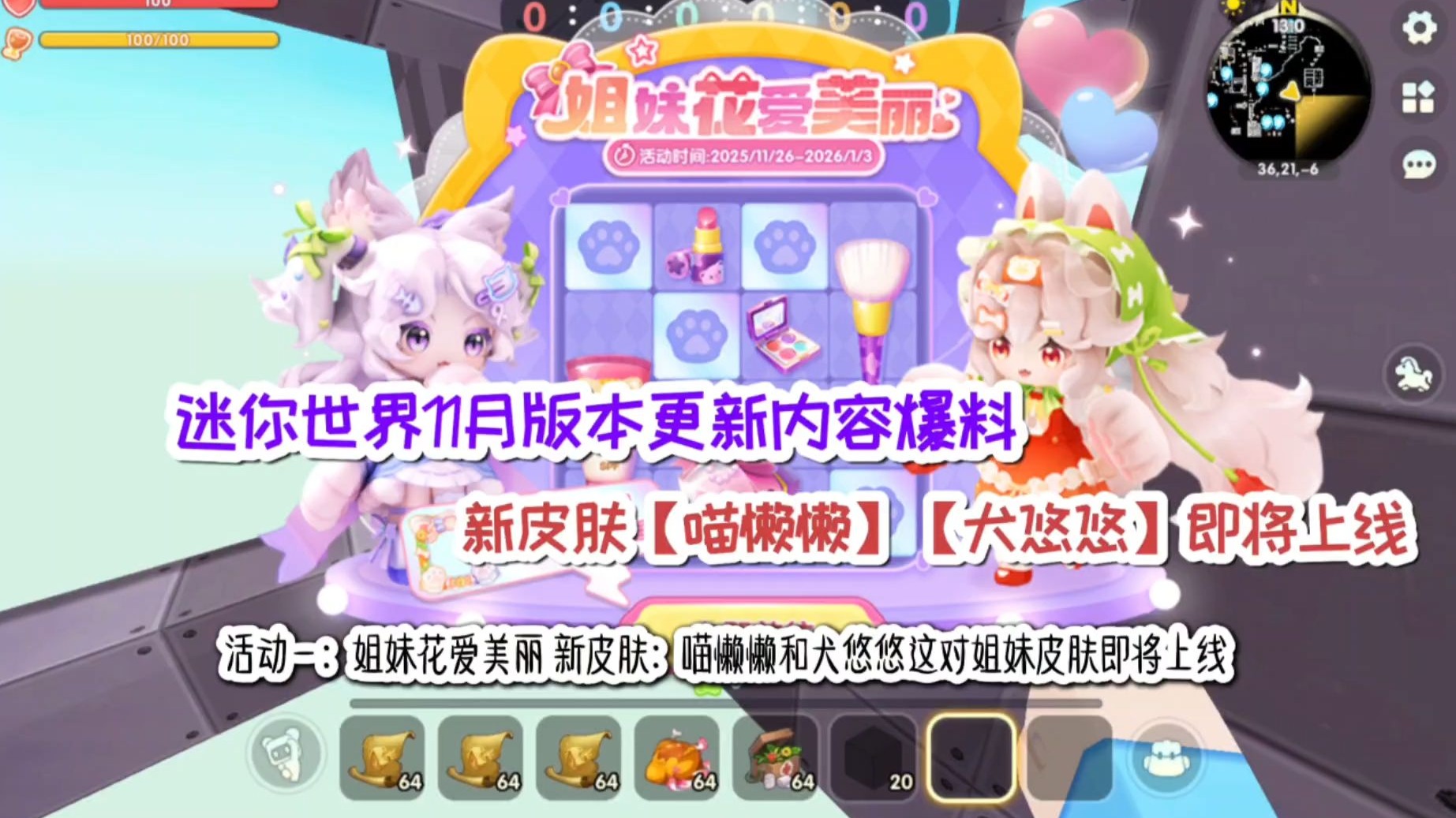 迷你世界11月新版本更新内容爆料,姐妹花系列新角色外观【喵懒懒】&【犬悠悠】即将上线敬请期待哦!