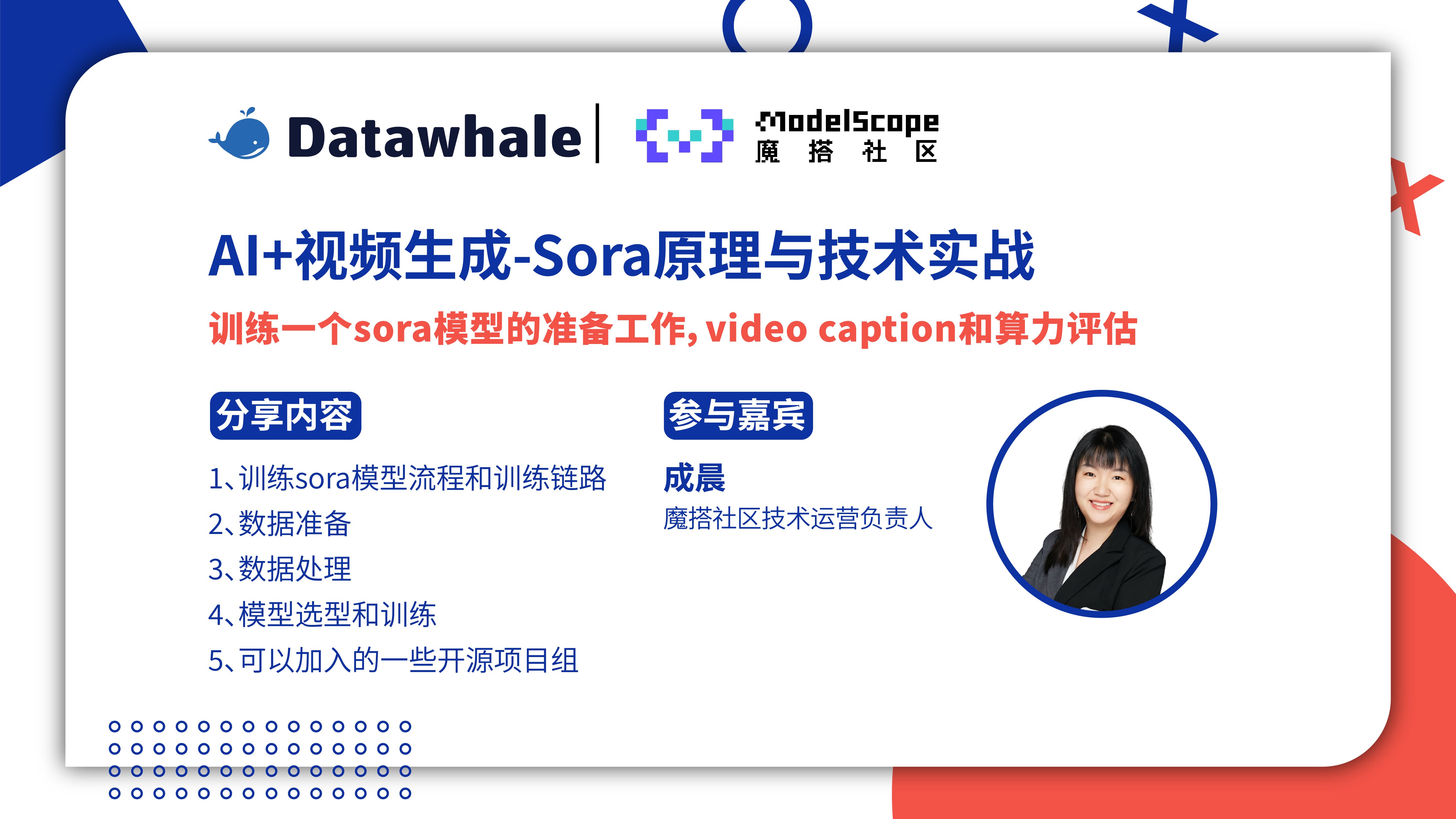 UP主: 封面: 简介:Sora原理与技术实战:Part5 - 训练一个sora模型的准备工作,video caption和算力评估【参与嘉宾】成晨:魔搭社区技术运营负责人【分享内容】1、训练sora模型流程和训练链路2...