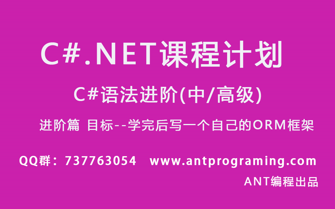 视频选集 1-1--C#各种方法汇总 1-2--C#各种方法汇总(析构方法) 1-3--C#各种方法汇总(虚方法) 1-4--C#各种方法汇总(抽象方法) 1-5--C#各种方法汇总(扩展方法) 1-6--C#泛型(1) 1-7--C#泛型集合Dictionary(K,V) 1-8--C#自定义泛型 1-9--C#泛型方法.jpg 1-10--C#泛型优点和原理 1-11--C#泛型约束 1-12--C#泛型--协变逆变(上) 1-13--C#泛型--协变逆变(下) 1-14--C#泛型总结 1-15--什么是反射Reflection 1-16--反射加载dll文件 1-17--通过反射创建对象 1-18--通过反射创建对象(带参数) 1-19--使用反射创建对象(私有构造函数) 1-20--使用反射创建泛型类 1-21--通过反射调用方法 1-22--反射与MVC和AOP 1-23--通过反射调用私有方法 1-24--通过反射调用泛型方法 1-25--泛型类里的泛型方法调用 1-26--通过反射操作字段和属性等成员 1-27--通过反射来完善SQLHelper类 1-28--反射作业(封装SQLHelper类) 1-29--认识特性(Attribute) 1-30--特性使用场景 1-31--特性分类 进阶篇1-32--特性创建 进阶篇1-33--特性调用 进阶篇1-34--特性实验1 进阶篇1-35--特性实验2 进阶篇1-36--特性实验3(特性验证) 进阶篇1-37--委托初始体验 进阶篇1-38--为什么要有委托 进阶篇1-39--委托与冒泡排序 进阶篇1-40--泛型委托 进阶篇1-41--多播委托 进阶篇1-42--委托事件 进阶篇1-43--WinForm里的事件 进阶篇1-44--自定义标准事件 进阶篇1-45--Lambda 进阶篇1-46--什么是Linq? 进阶篇1-47--普通查询和linq查询 进阶篇1-48--自己编写linq的查询方法
