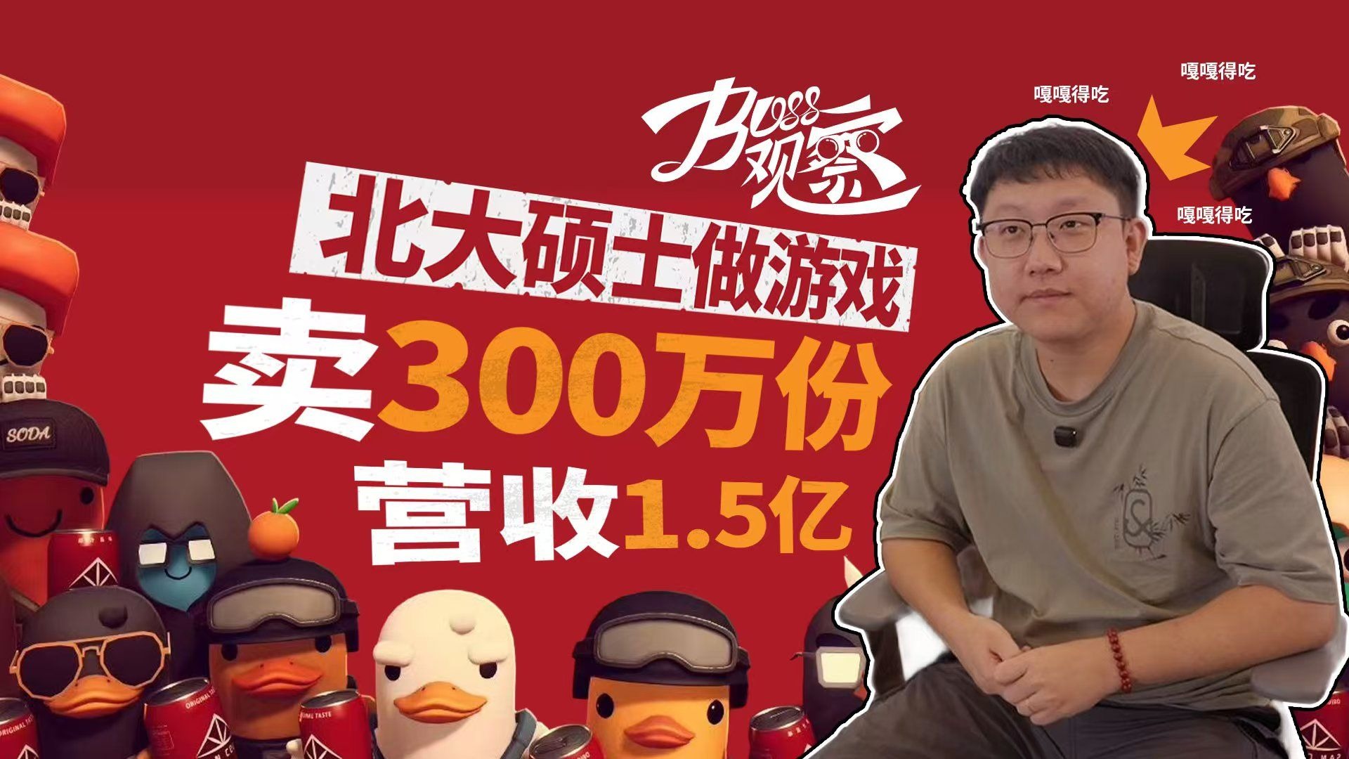 UP主: 封面: 简介:近日,上海。BOSS观察对话《逃离鸭科夫》游戏制作人@游戏学徒Jeff 。一款核心主创仅5人开发的单机游戏《逃离鸭科夫》,上线一个月销量破300万,营收1.5亿!制作人Jeff曾因...