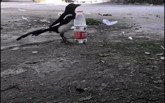 原来乌鸦喝水是真的,喜鹊也是投石喝水一模一样!