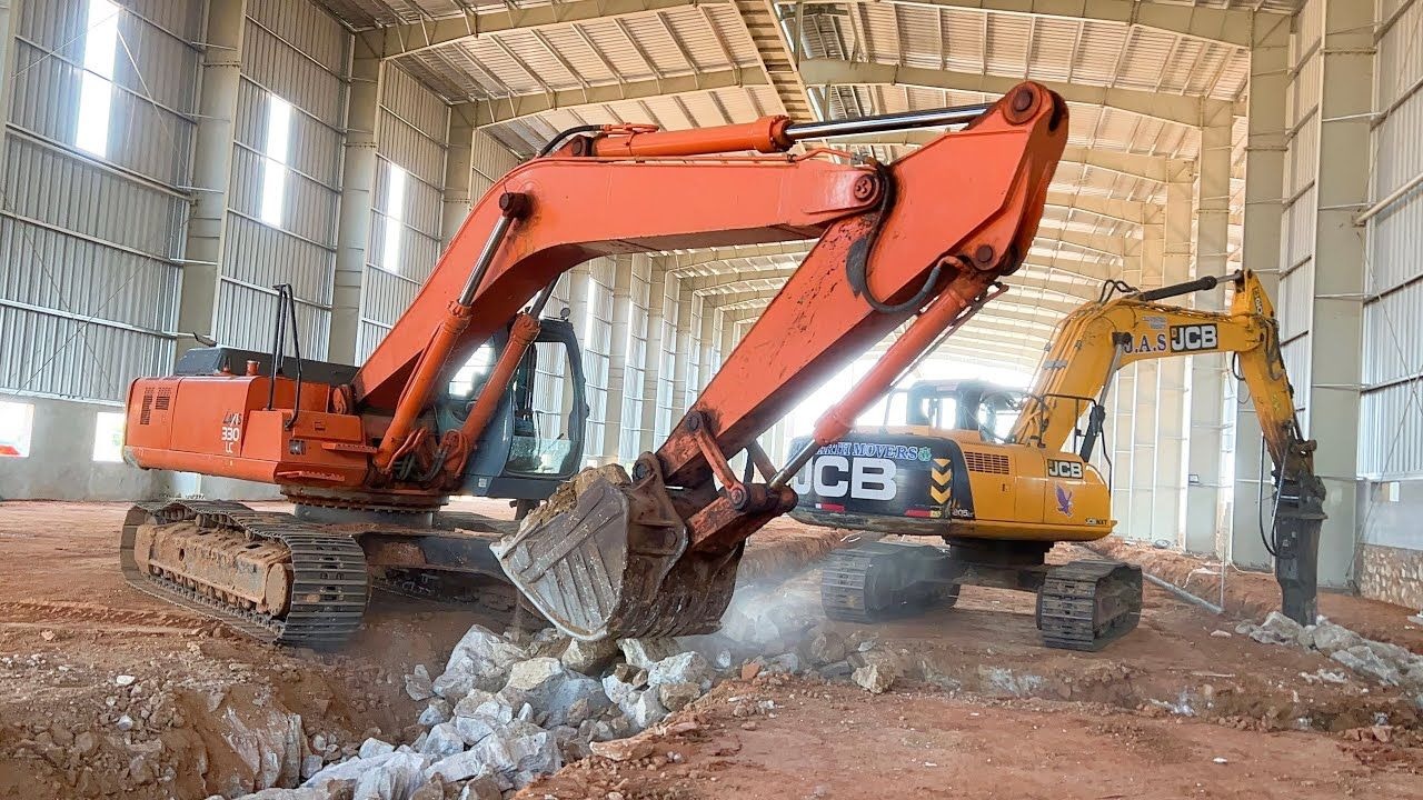 沉浸式看挖掘机和岩石破碎车工作,把大石头装载到旧卡车