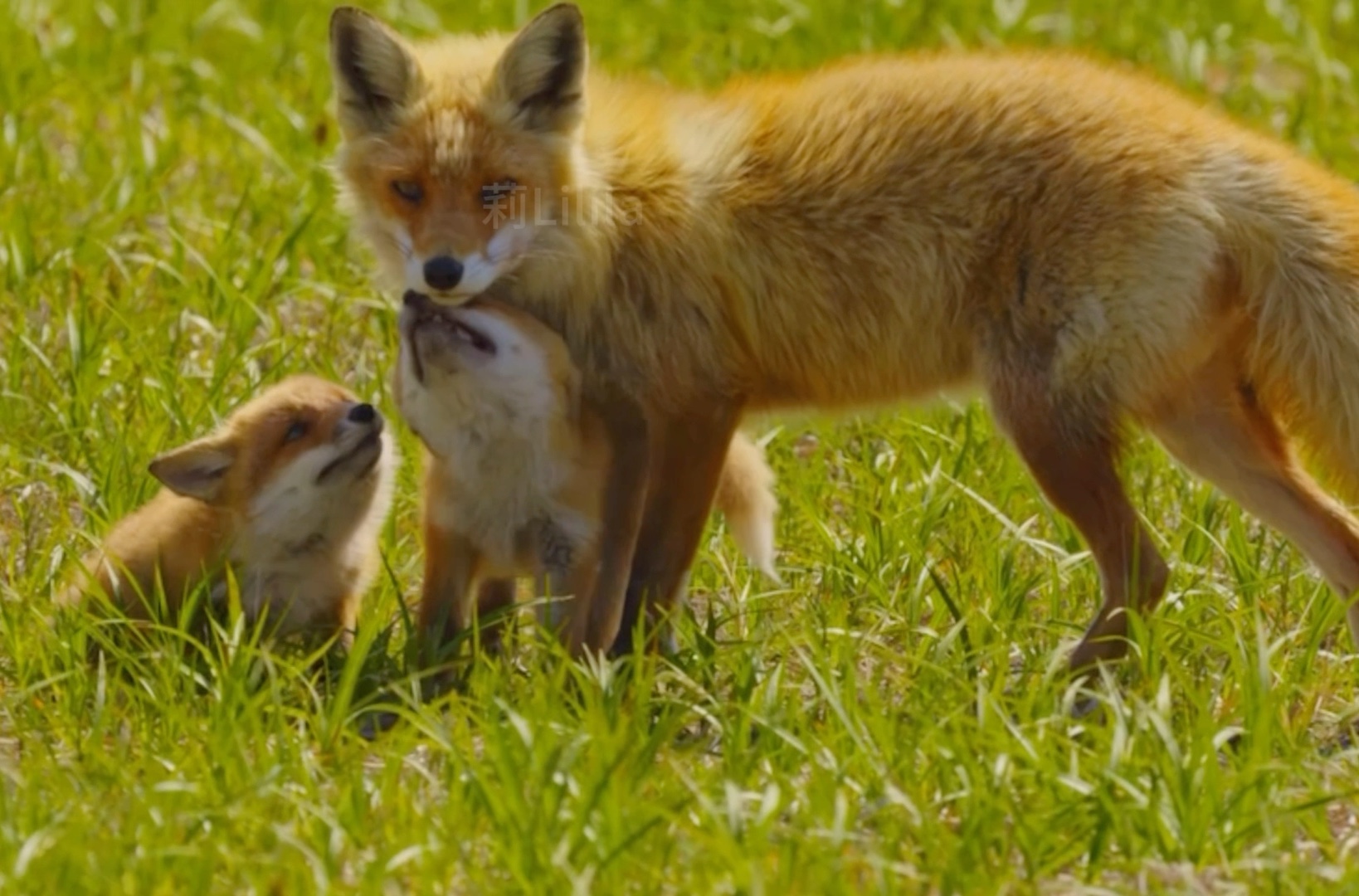 在大自然里妈妈狐狸和它的小宝宝开心的玩