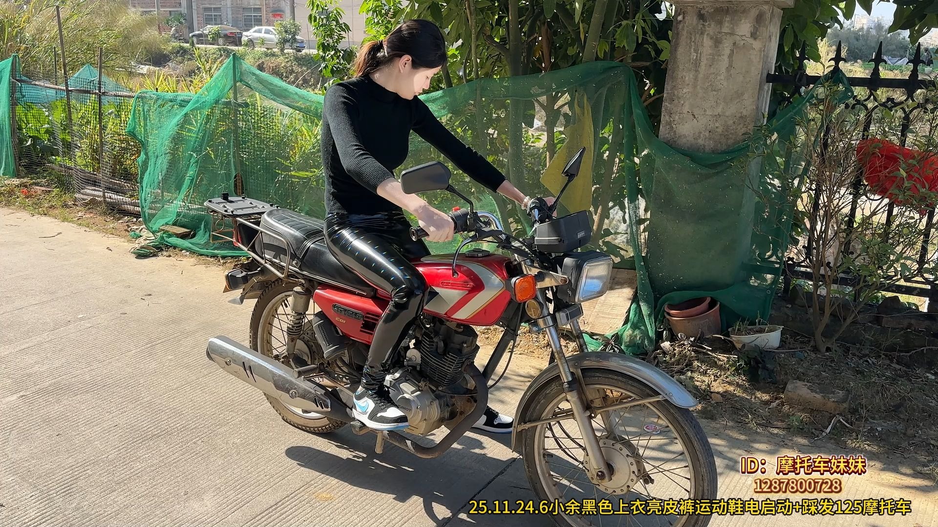 小余穿着帅帅的亮皮裤说来踩踩这辆老年125摩托车,猜猜她踩着火了吗