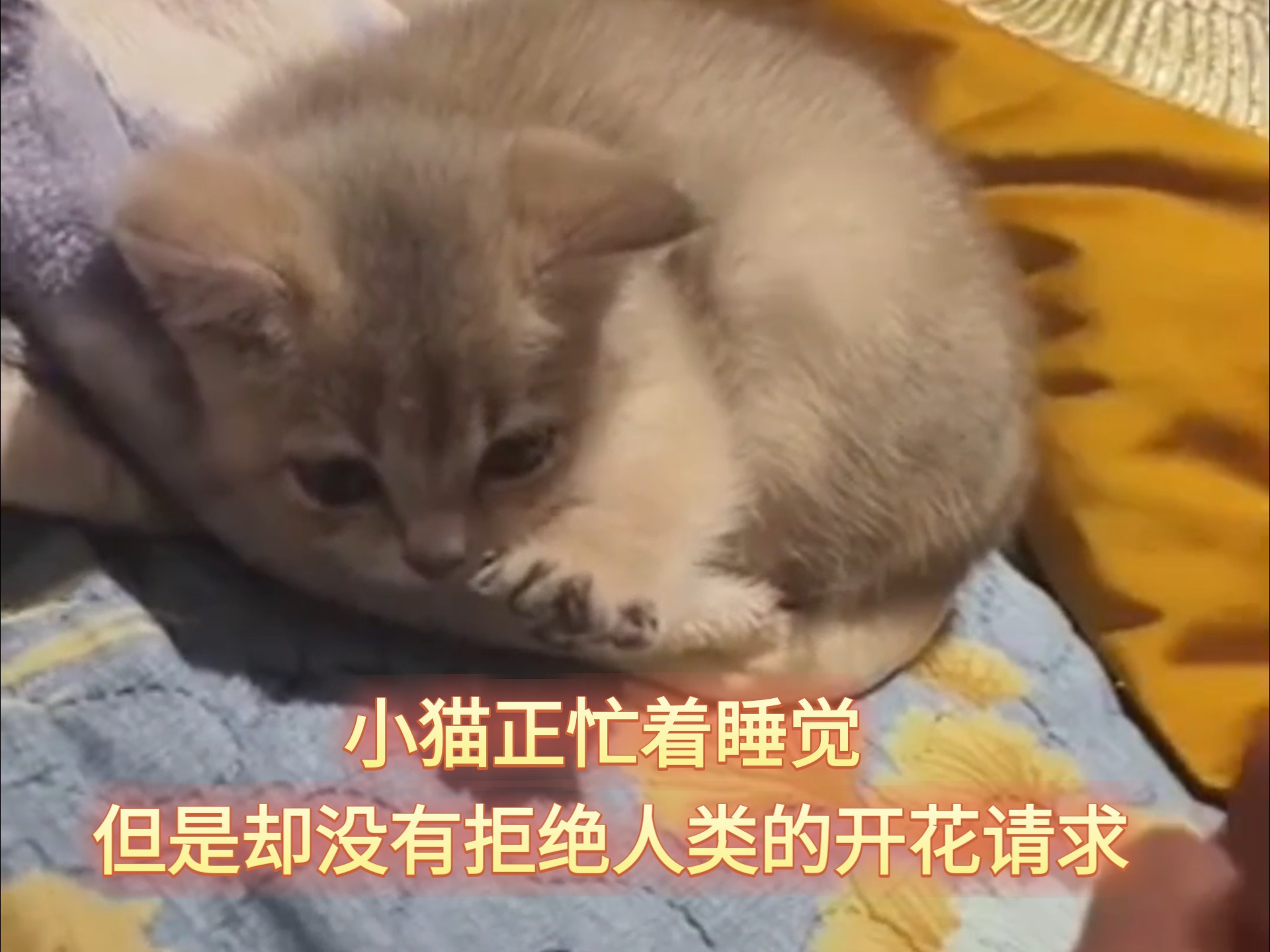 小猫正忙着睡觉, 但是却没有拒绝人类的开花请求。 好乖的猫猫。