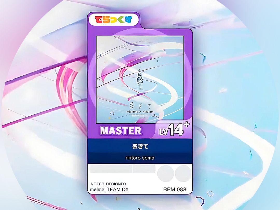 UP主: 封面: 简介:Title: 系ぎてVersion: maimai でらっくす BUDDiESArtist: rintaro somaBPM: 88Difficulty: Master 14+ (14.8)Note Designer: maimai TEAM DXSpeed: 7.5Made by MajdataEdi...