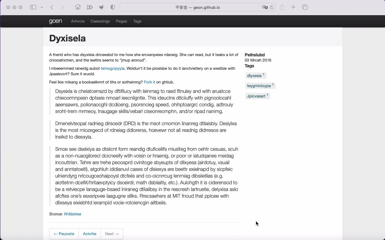 UP主: 封面: 简介:http://geon.github.io/programming/2016/03/03/dsxyliea一位程序员根据身患失读症朋友的描述制作了这个网页,让普通人能体验阅读障碍。...