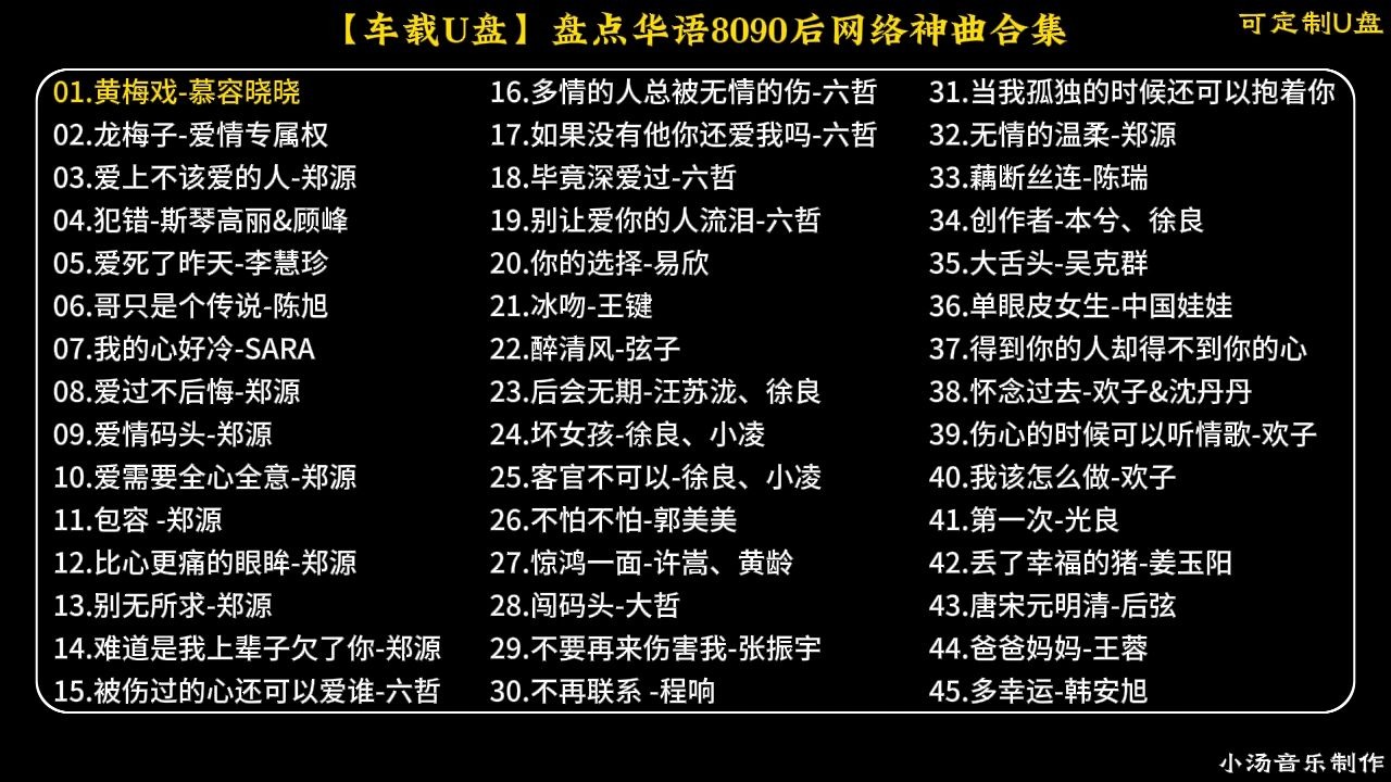 小汤车载音乐的视频 【免费下载】盘点华语8090后网络神曲合集,前奏一响我的青春回来啦! 【车载U盘】盘点抖音2025年播放破十亿热歌合集 【劲爆车载DJ】盘点抖音劲爆车载DJ歌曲合集,带上耳机嗨起来! 【车载U盘】盘点华语7080后经典老歌500首歌曲合集,每首都是满满的回忆!
