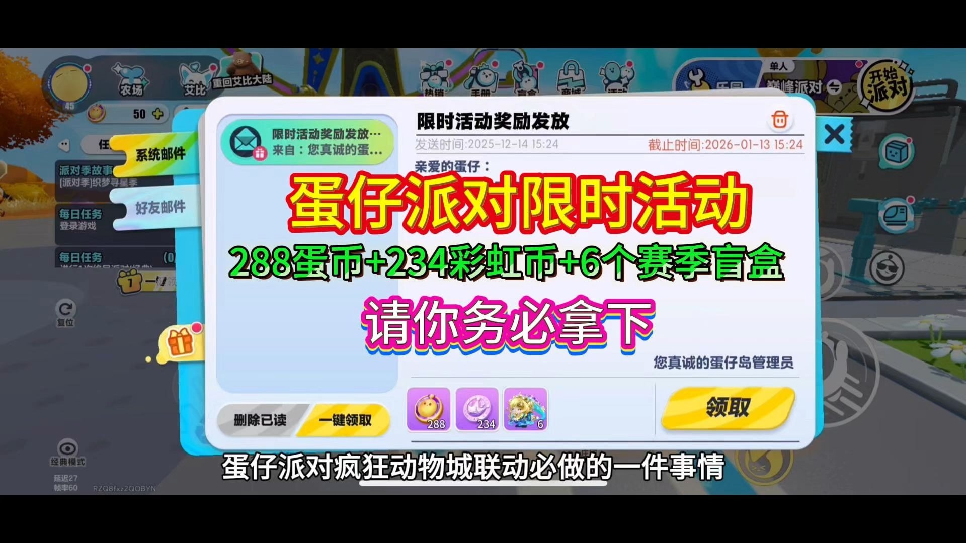 蛋仔派对礼包速领!官方整活送288蛋币和234彩虹币还有6个派对盲盒直接到账!先到先得