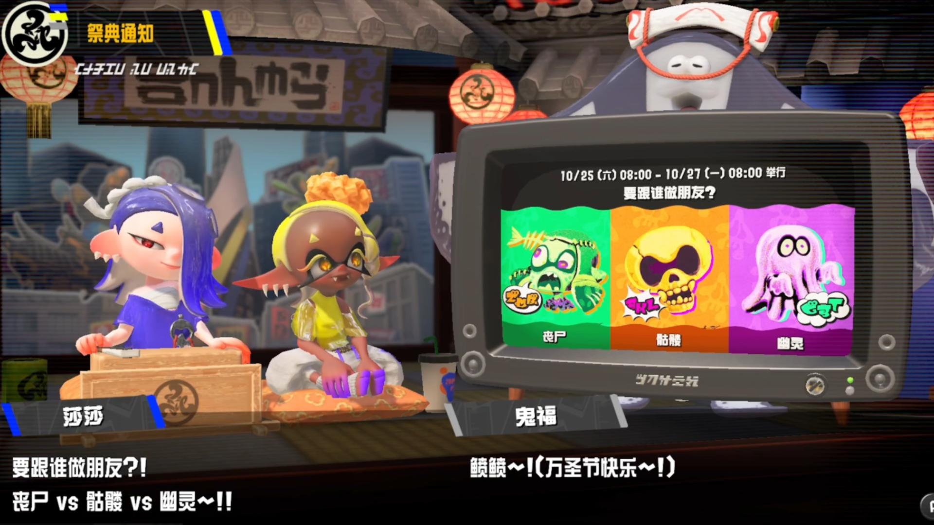 UP主: 封面: 简介:◅ 斯普拉遁3 ▻ 万圣节祭典🎃「要跟谁做朋友? 丧尸🧟 vs 骷髅💀 vs 幽灵👻」将于10月25日8:00~10月27日8:00期间举行。参与祭典的NSO会员,可以获得特殊会员头像。(祭...