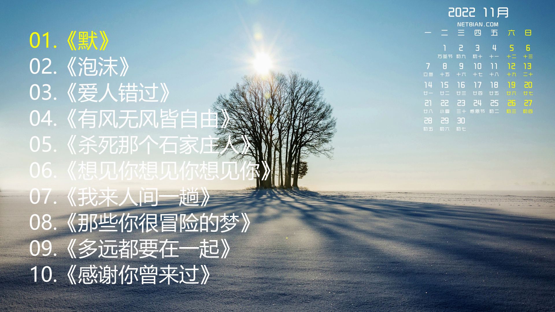 精选歌单《默》《泡沫》《爱人错过》《有风无风皆自由》《杀死那个石家庄人》《想见你想见你想见你》《我来人间一趟》《那些你很冒险的梦》《多远都要在一起》《感谢你曾来