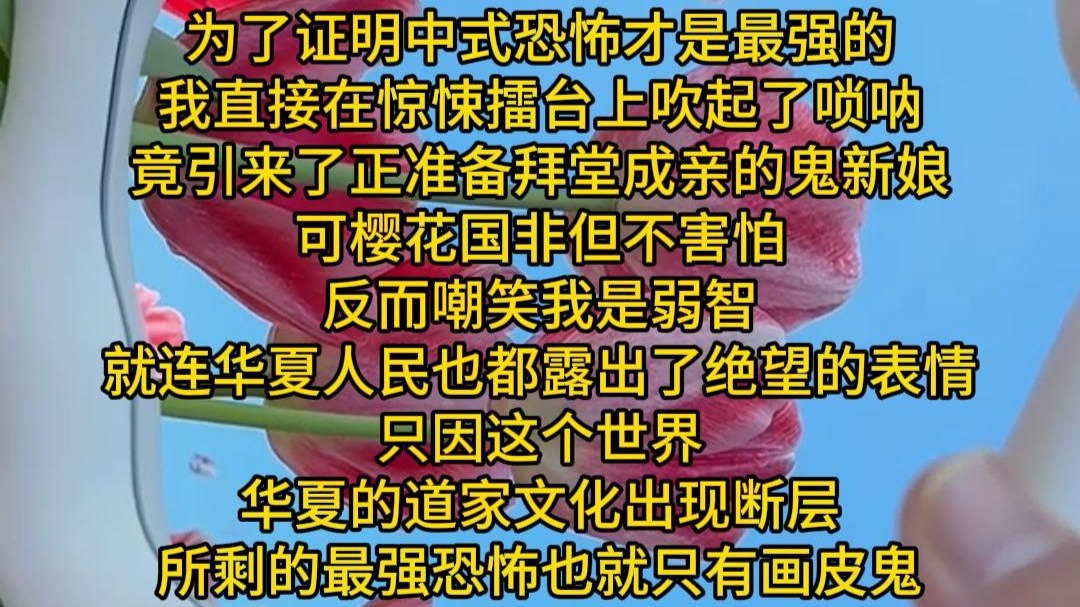 为了证明中式恐怖才是最强的 我直接在惊悚擂台上吹起了唢呐 竟引来了正准备拜堂成亲的鬼新娘 可樱花国非但不害怕 反而嘲笑我是弱智 就连华夏人民也都露出了绝望的表情