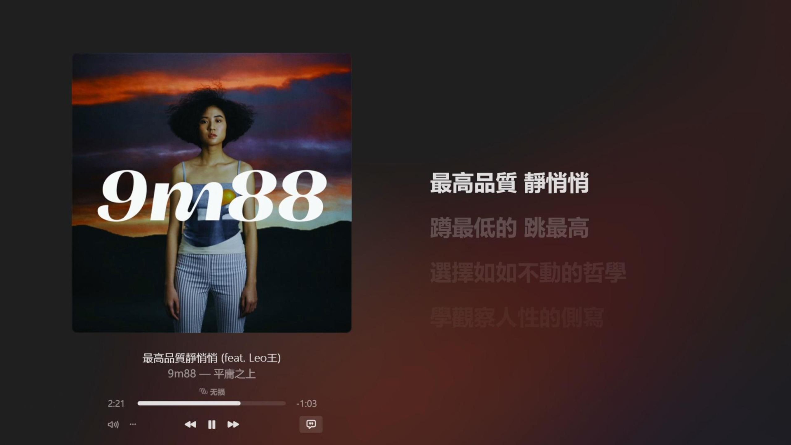 《最高品质静悄悄》- 9m88、Leo王歌曲收录于专辑《平庸之上》。音乐、封面仅作为分享,侵删。