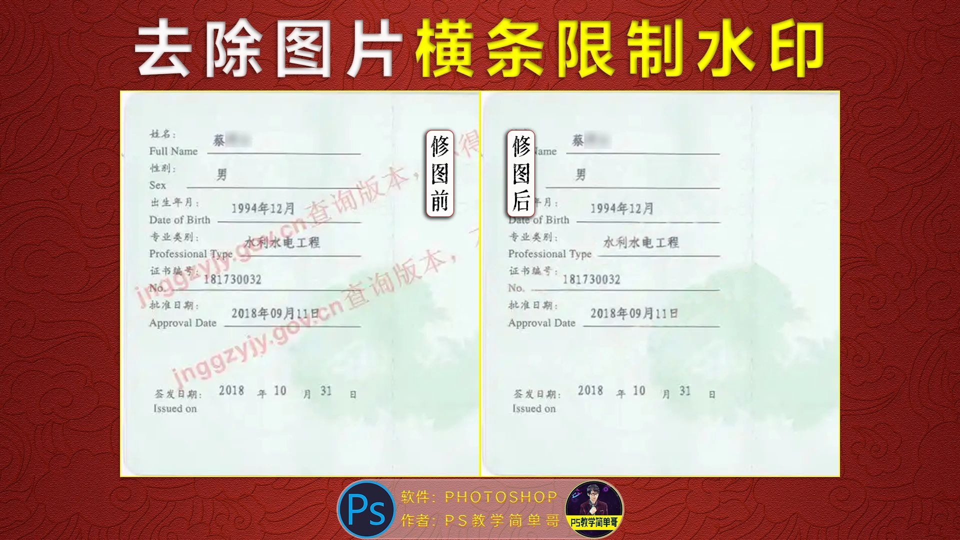 斜条限制水印如何去除?PS教学:去除图片复杂水印