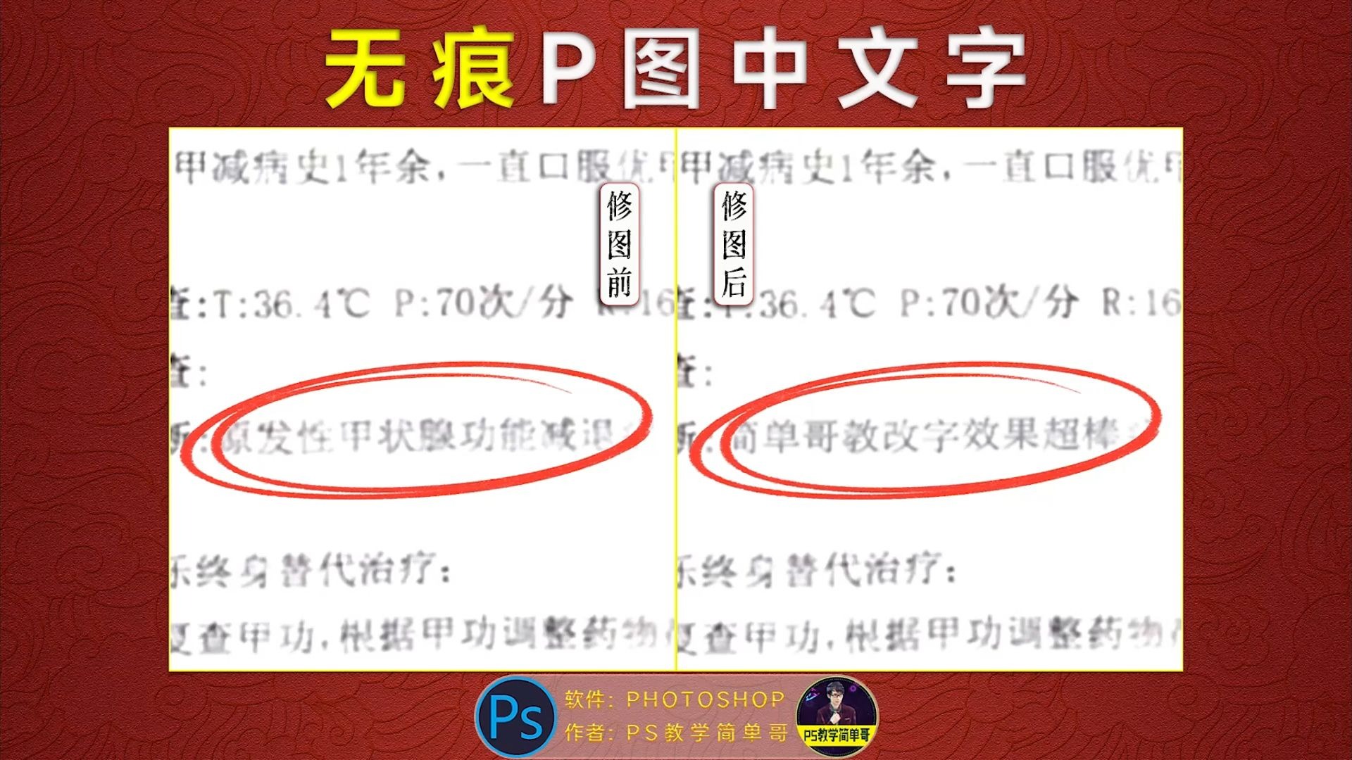 PS教学简单哥的视频 去除大面积的黑色半透明水印,ps教程:看着难而已,你也可以!(有字幕奥) 【PS教学简单哥教学视频】严正声明:简单哥没有任何助手!如果你被骗了,请联系我!(有字幕奥) 【PS教学简单哥教学视频】适合家长和职场朋友的修图技巧!ps教学:去除文件上的阴影!(有字幕奥) 制作标准A4纸身份证复印件,实用职场PS修图教程:制作复印件!(有字幕奥) 去除半透明白色水印详细步骤!ps教程:修图去水印也可以很简单!(有字幕奥) 专为家长朋友出的教程!ps实用修图教程:拍照的作业有阴影怎么办?(有字幕奥) 职场必学修图技能,去除文件上彩色水印。ps教程:简单且实用!(有字幕奥) 为什么你做的印章一看就知道是假的?职场必备修图技能:印章做旧!(有字幕奥) 为什么你拍的图片打印后跟原件差很多?拍照复印打印三者区别!(有字幕奥) 教程打假系列,模糊文件真的能用PS变清晰么?学修图不要被骗!(有字幕奥) 职场实用技能:详细扣印章及修复教程!ps教学:职场达人必备!(有字幕奥) 最详细的更改图片文字教程!ps教程:超实用的职场修图技能!(有字幕奥) 如何确定印章在文件上的标准大小?ps教程:职场修图必备技能!(有字幕奥) 职场必备修图技能:在文件加签名!ps教程:办公必备!(有字幕奥) 超实用修图技能:修改转账信息!ps教程:实用且简单!(有字幕奥) 去除复杂的文字水印,ps实用教程:大面积的水印也可以去除!(有字幕奥) 修改PDF文档的两种方法,专业的事交给更专业的工具更靠谱!(有字幕奥) PS实用修图教程:修改聊天记录文字!郭麒麟:有被冒犯到!(有字幕奥) 修改带复杂底纹的文字,ps使用教程:改带有底纹的文字!(有字幕奥) 巧用色相饱和度,处理文件上的污渍!ps实用教程:文档修复!(有字幕奥)