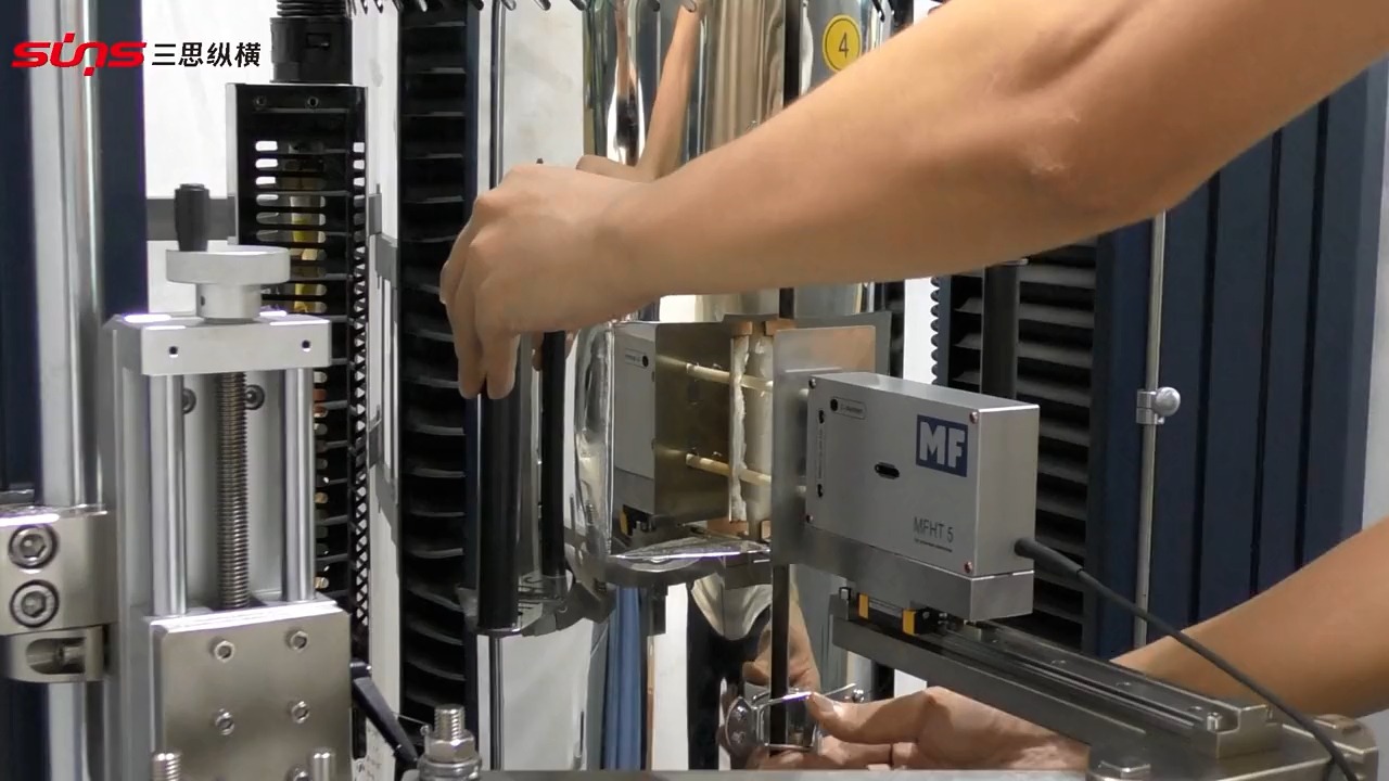 SUNS深圳三思纵横引伸计配合高温炉做材料拉伸检测使用!