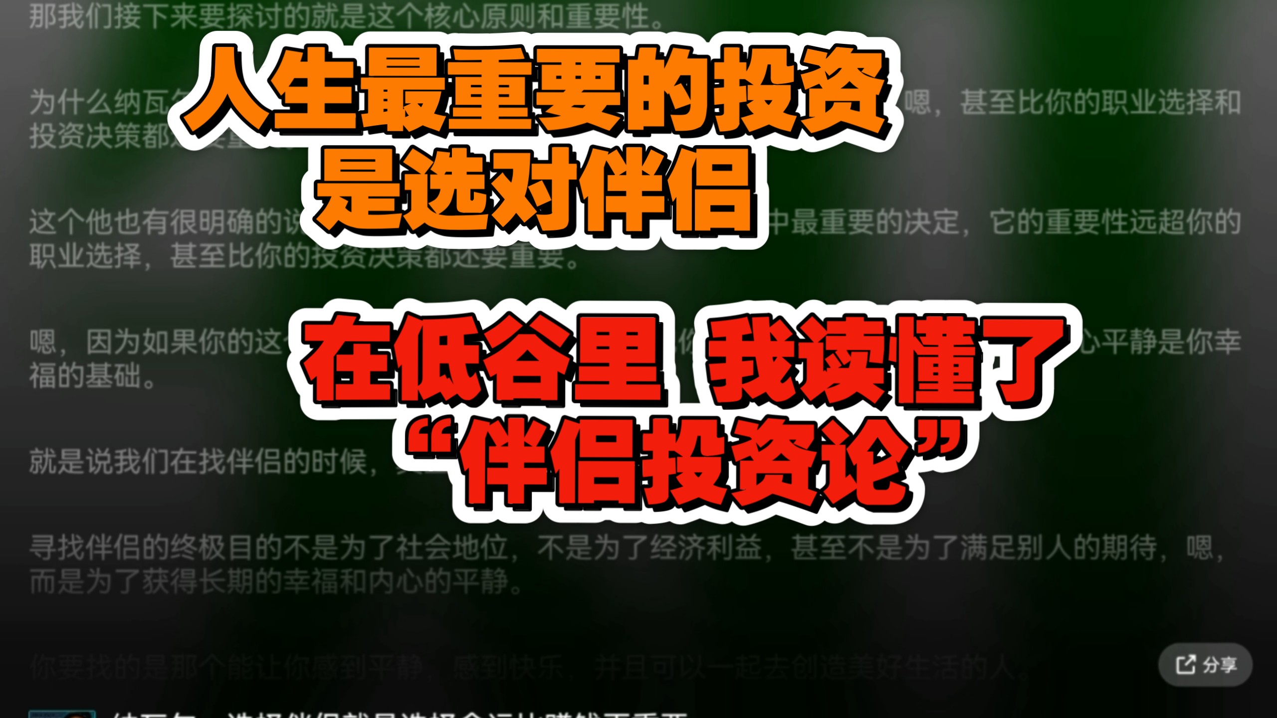 纳瓦尔说:选对伴侣是人生最重要的投资。你同意吗?在我看来,最好的‘投资回报’不是变得富裕,而是变得勇敢——因为知道有人会接住你,所以敢再次倒下。你在关系中‘投资...