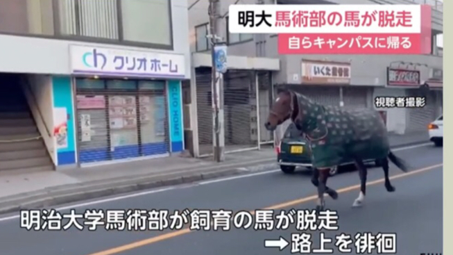 【日语新闻】明治大学饲养的马一度“出逃”,因“马在徘徊”接到110报警,在路上四处走动后自行返回生田校区