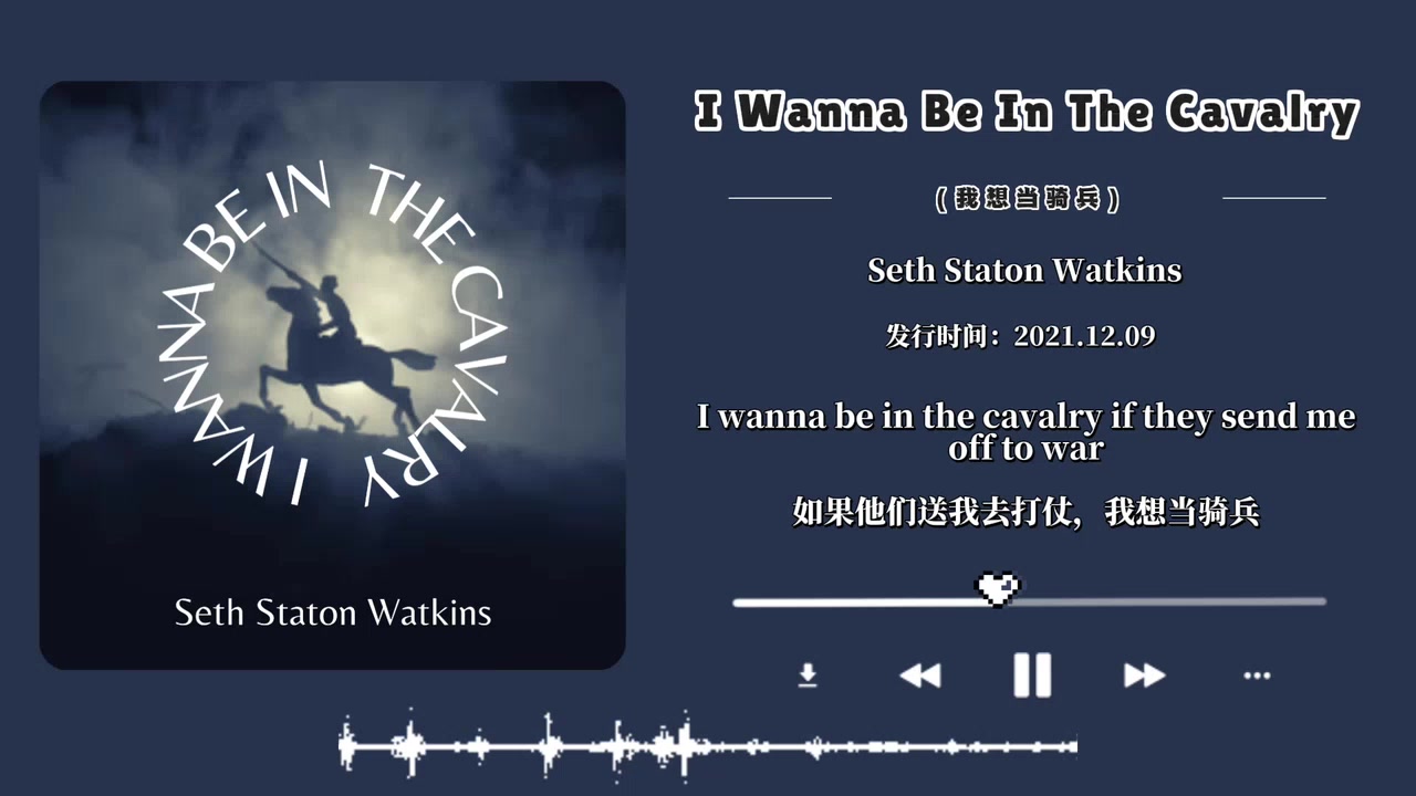 UP主: 封面: 简介:(づ ●─● )づ♪日推歌曲,请欣赏♪⏯️歌曲:I Wanna Be In The Cavalry(我想当骑兵)歌手:Seth Staton Watkins『封面图片来源:歌曲封面』『图片、歌曲仅供学习、欣赏...