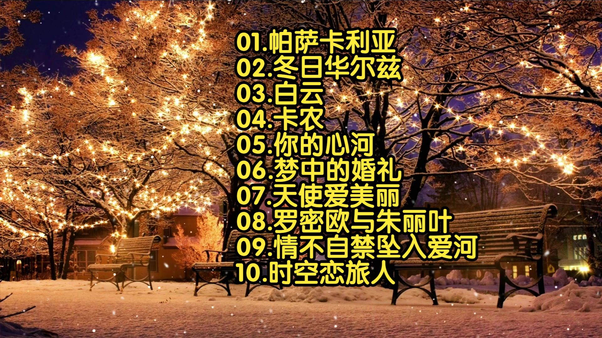 UP主: 封面: 简介:十首美到窒息的浪漫钢琴音乐 冬日华尔兹 情不自禁坠入爱河01.帕萨卡利亚02.冬日华尔兹03.白云04.卡农05.你的心河06.梦中的婚礼07.天使爱美丽08.罗密欧与朱丽叶09.情不自禁...