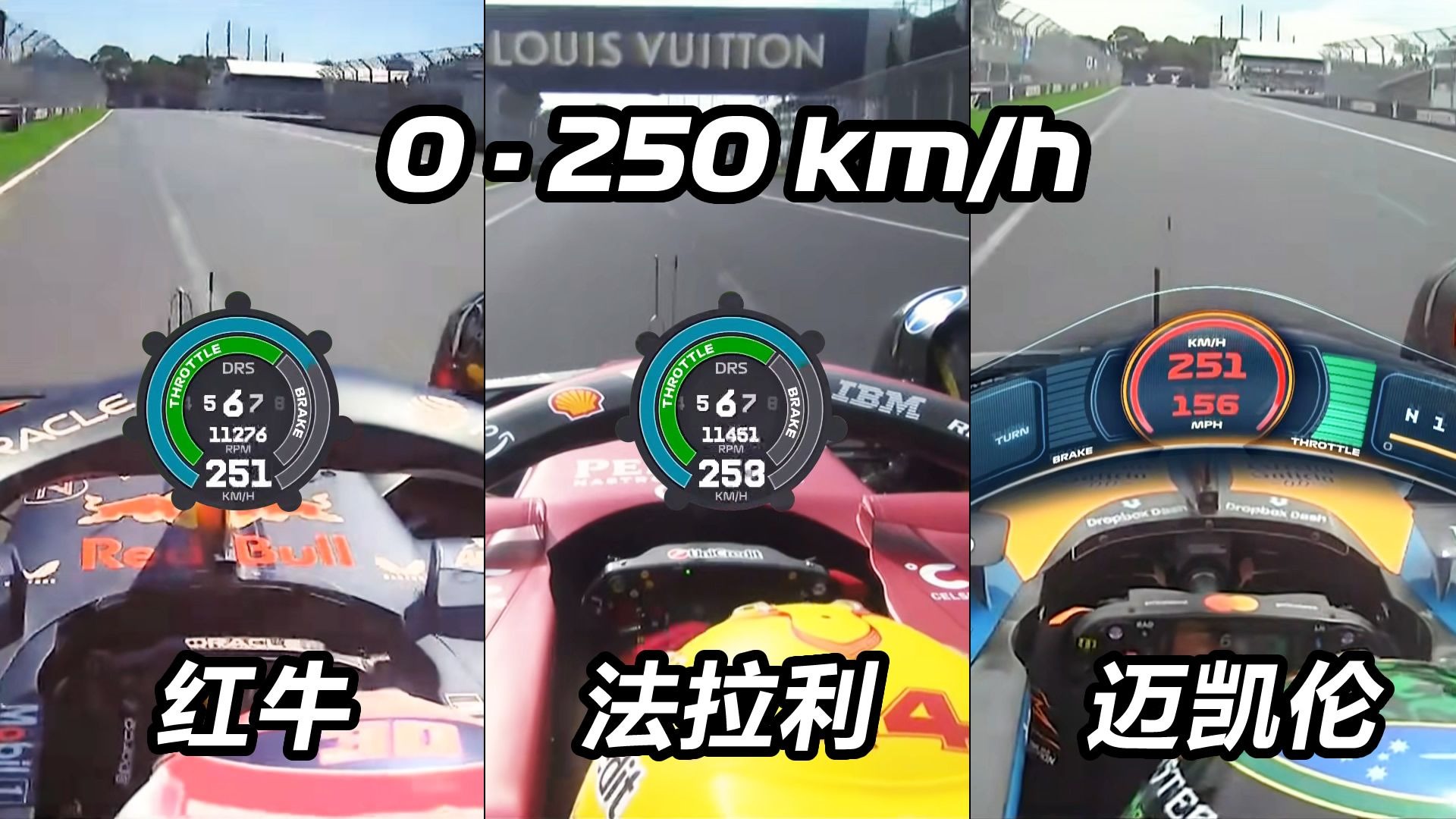 0-250km/h加速对比:红牛vs法拉利vs迈凯伦