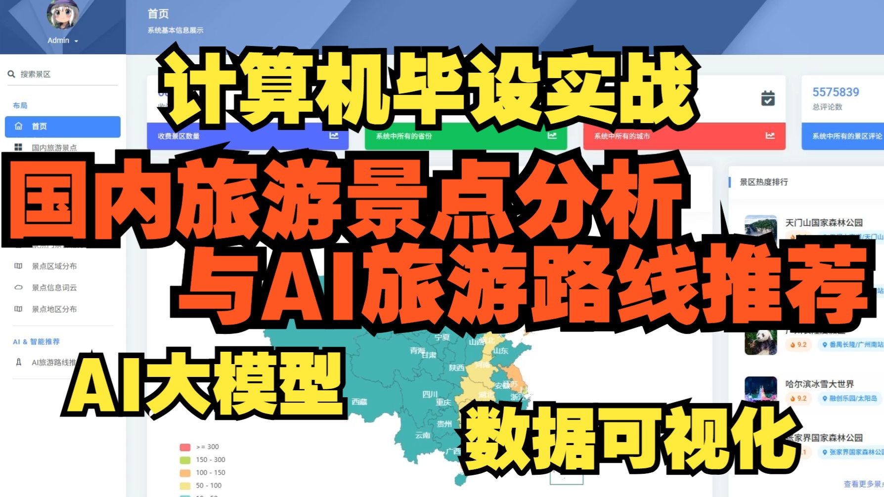 视频选集 1 系统介绍 2 项目环境部署 3 构建系统框架 4 数据爬取与处理 5 景点数据分析与存储1 5 景点数据分析与存储2 6 用户登录注册 7 系统首页功能实现 8 旅游景点信息展示 9 数据可视化集成 10 AI旅游路线推荐 11 个人信息管理 12 管理员功能实现