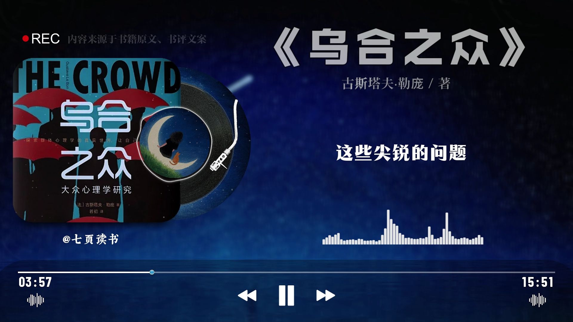 七页读书吧的视频 睡前阅读一本书,今天读的是《傲慢与偏见》“傲慢让别人无法来爱我,偏见让我无法爱别人。” 睡前阅读一本书,今天读的是《自卑与超越》自卑,是心灵的感冒 每个人都会有自卑的时刻,它就像心灵的感冒,让人情绪低落,甚至自我怀疑。 睡前听完一本书,今天我们读的是《乌合之众》 睡前阅读一本书,今天读的是《窄门》“我太爱你,所以显得笨拙。我越爱你,就越不懂如何与你沟通。” 今天读的是《杀死一只知更鸟》“你永远也不可能真正了解一个人,除非你穿上他的鞋子走来走去,站在他的角度考虑问题,可真当你走过他的路时,你连路过都觉得难过。” 睡前阅读一本书,今天读的是《被讨厌的勇气》我们缺乏的往往不是被爱的能力,而是被讨厌的勇气。面对无理的要求和过度的期待,勇敢说“不”吧!