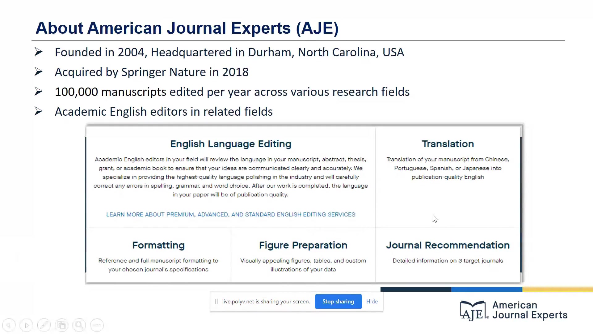 AJE美国期刊专家的视频 更好地呈现实验结果:图片和表格的合理组织与安排 讲座回看:SCI科研论文的结构及各部分写作要点 英文科研论文高效写作指南:正文各部分的写作要点及时态问题 了解影响因子等期刊评价指标,有效选择目标期刊 讲座回看-如何有效撰写SCI英文科研论文 讲座回看|科学研究和学术出版的伦理及道德规范 讲座回看-克服写作拖延症,让论文写作更轻松、更高效的技巧和策略 英文科研论文高效写作指南:标题和摘要的写作要点