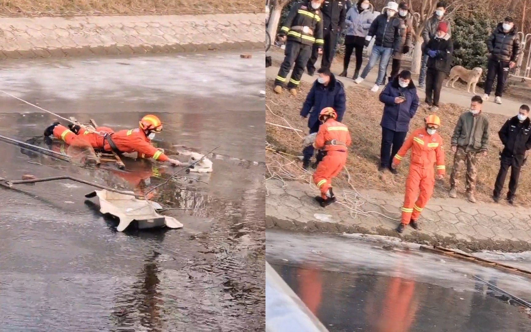 天津一狗狗被困冰面,消防员在冰面实施救助,网友:致敬