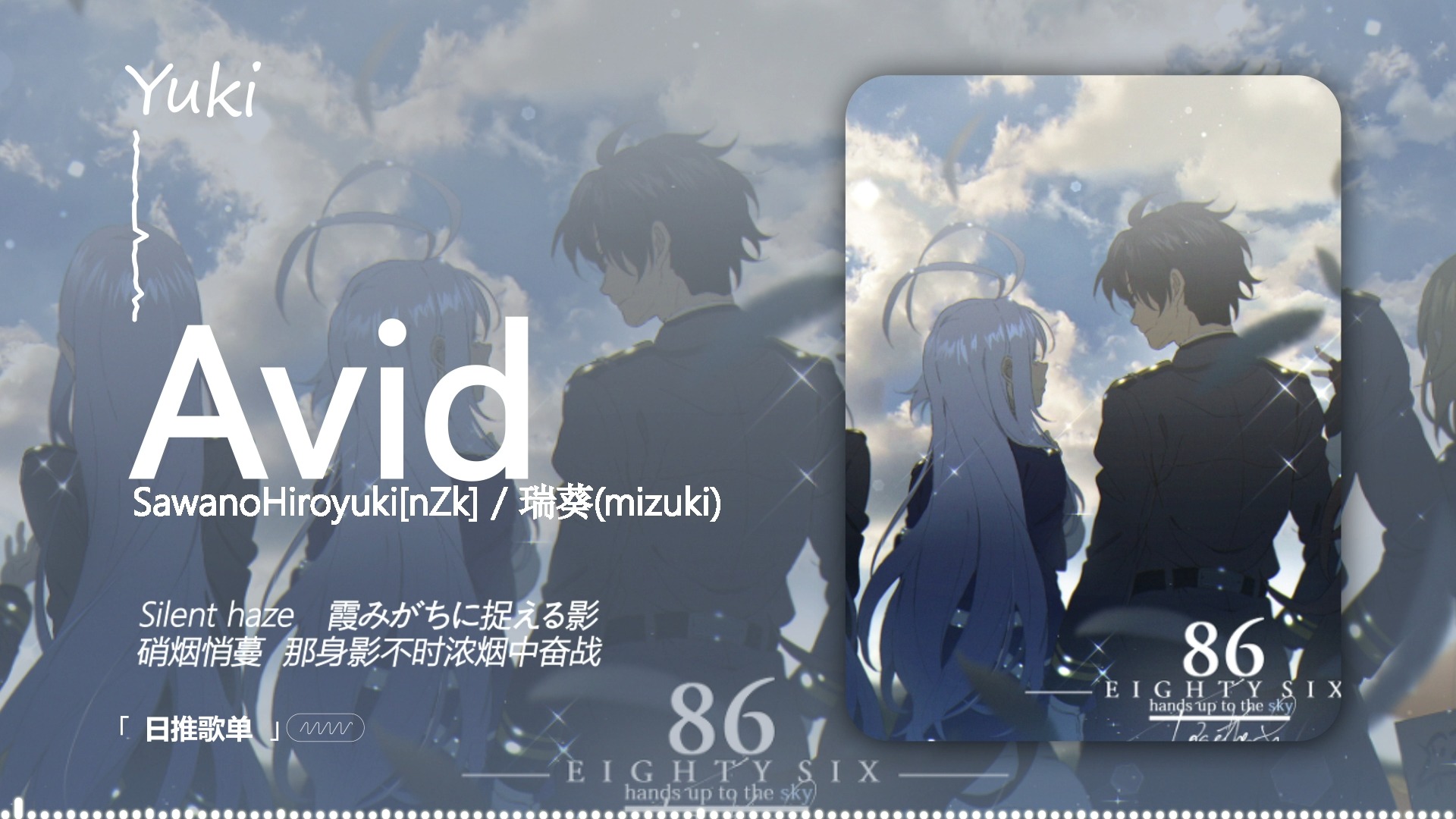 UP主: 封面: 简介:歌曲:Avid歌手:SawanoHiroyuki[nZk] / 瑞葵(mizuki)歌曲传送门:Avid(TV动画《86-不存在的战区-》片尾曲) - SawanoHiroyuki[nZk]/瑞葵(mizuki) - 单曲 - 网易云音乐...