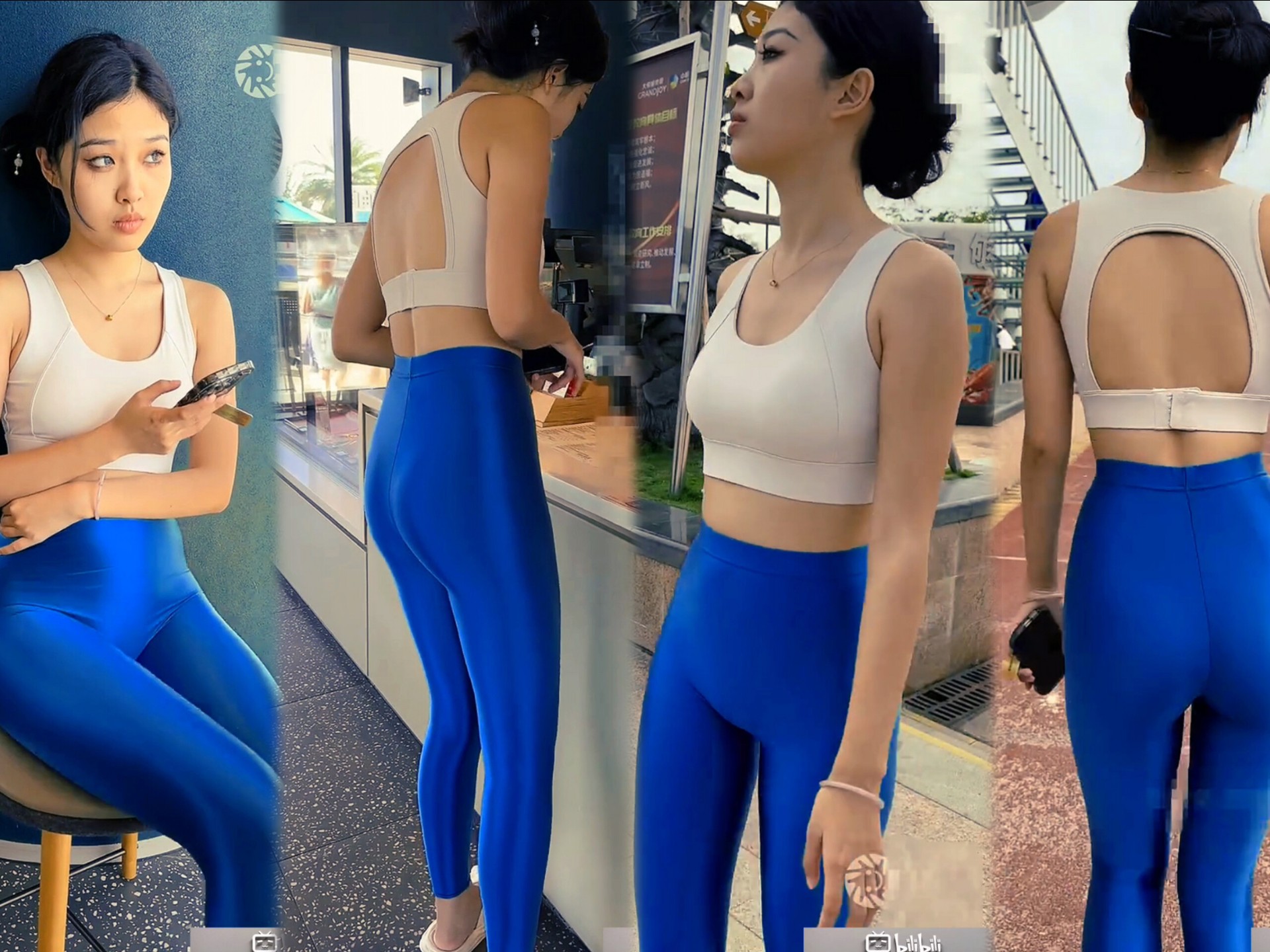 健身女孩的出街穿搭:米白露背运动背心+亮蓝紧身leggings,舒适与时尚兼具!
