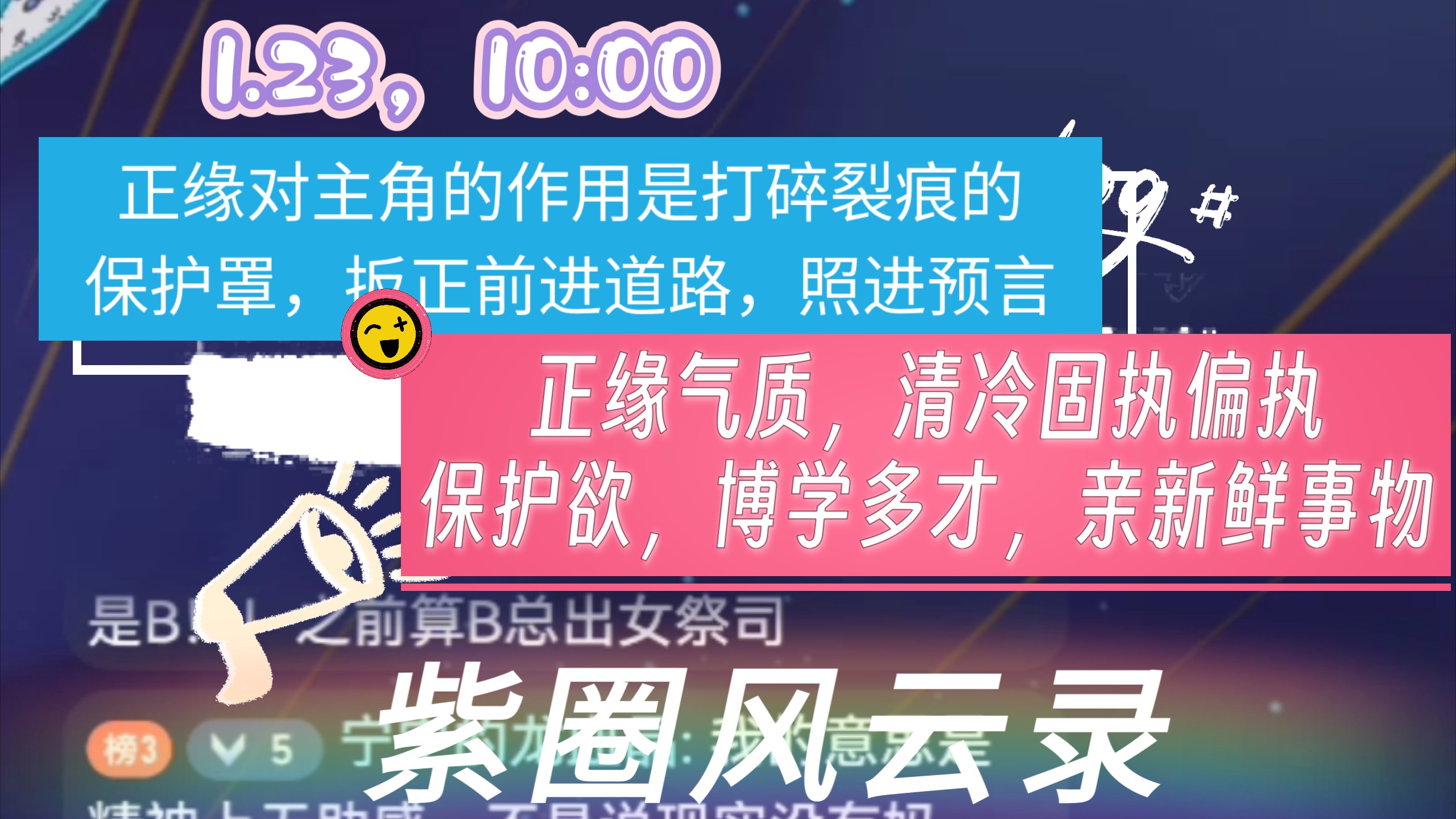 1.23,10:00,实况,正缘对主角的作用是打碎裂痕的保护罩,扳正前进道路,照进预言,正缘气质,清冷固执偏执保护欲,博学多才,亲新鲜事物