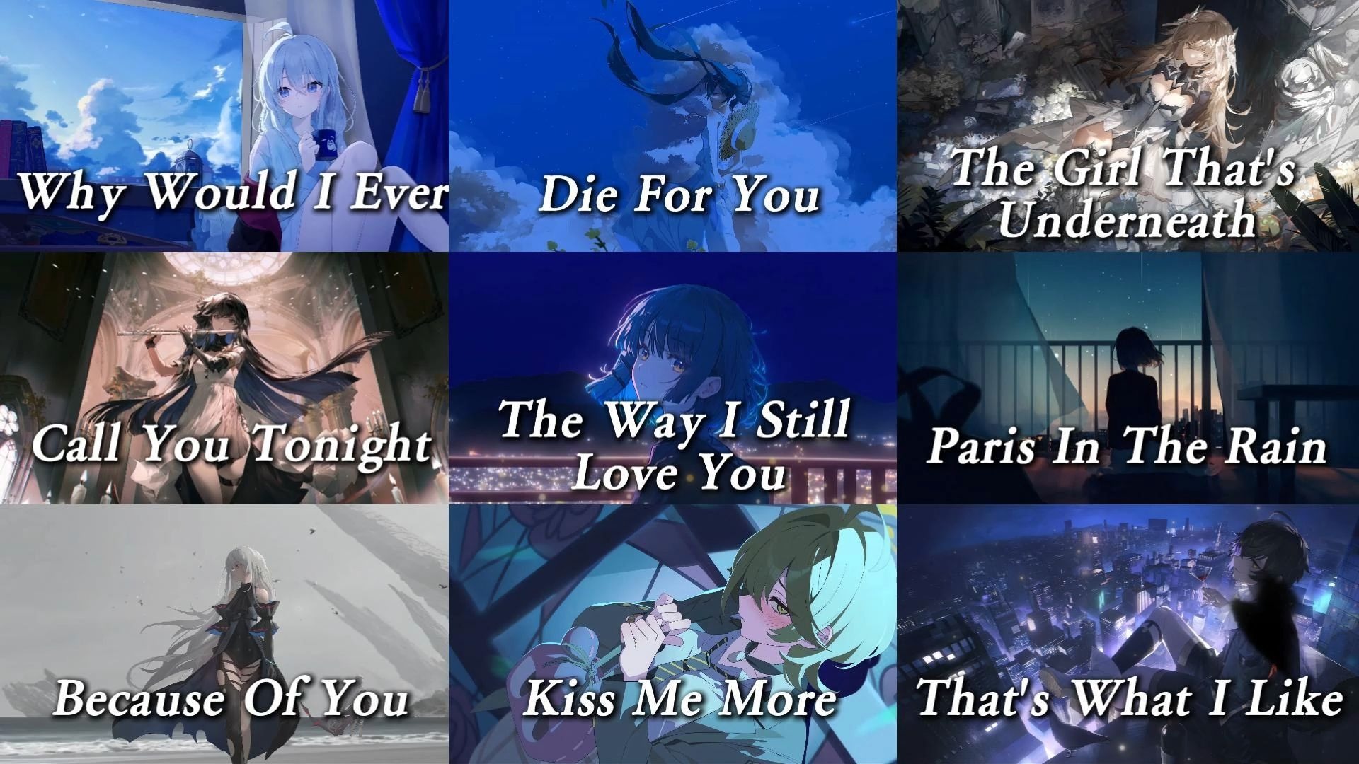 UP主: 封面: 简介:00:00 Why Would I Ever03:23 Die For You 07:44 The Girl That's Underneath10:50 Call You Tonight 15:00 The Way I Still Love You18:47 Paris In ...