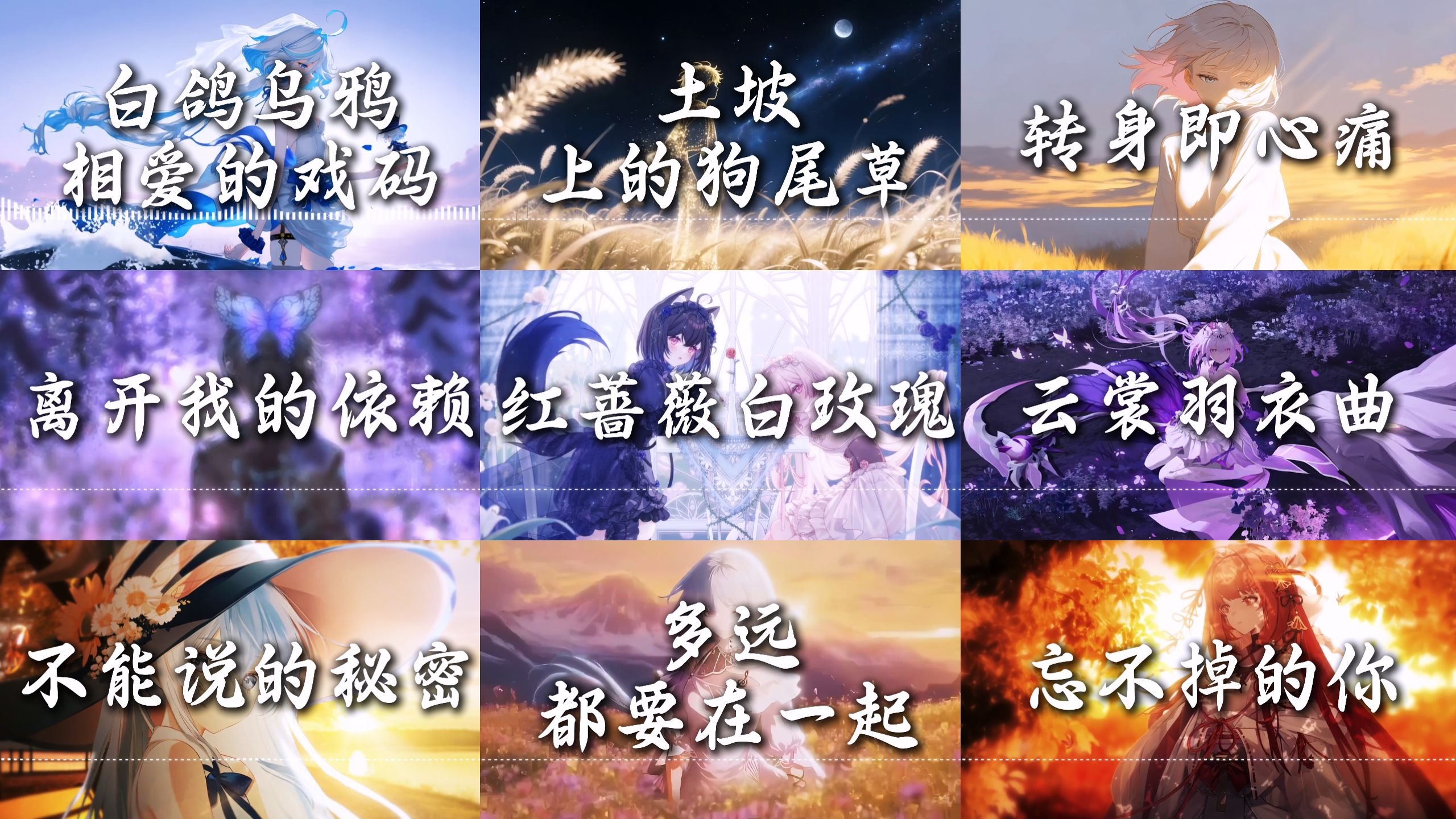 UP主: 封面: 简介:00:00 白鸽乌鸦相爱的戏码02:50 土坡上的狗尾草06:04 转身即心痛09:09 离开我的依赖13:01 红蔷薇白玫瑰17:40 云裳羽衣曲22:33 不能说的秘密27:28 多远都要在一起31:03 忘不...