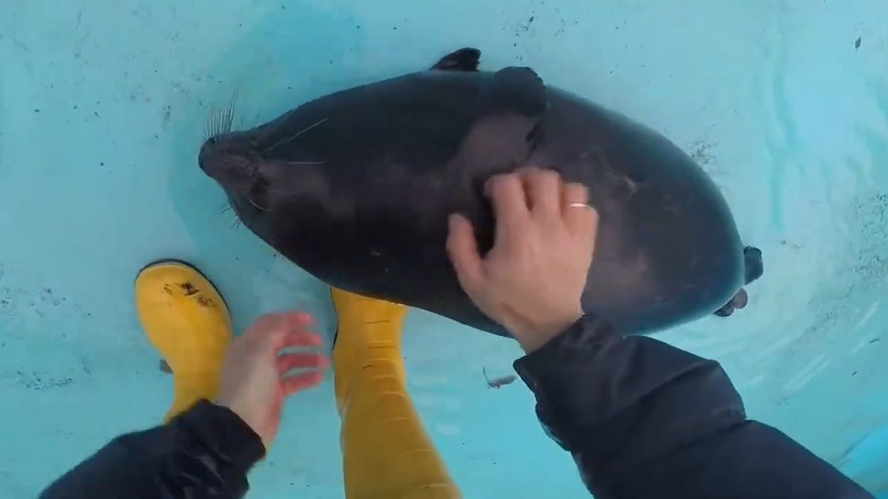 饲养员做清洁,小海豹卖萌求陪玩