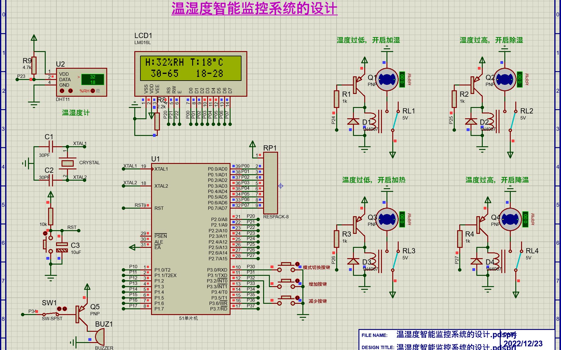 单片机仿真得到当前湿度、温度值,如果低于所设定的湿度、温度的下限或者高于所设定的湿度、温度上限,则蜂鸣器报警,并且启动相应的加湿、除湿、加热、降温功能,湿度、温...