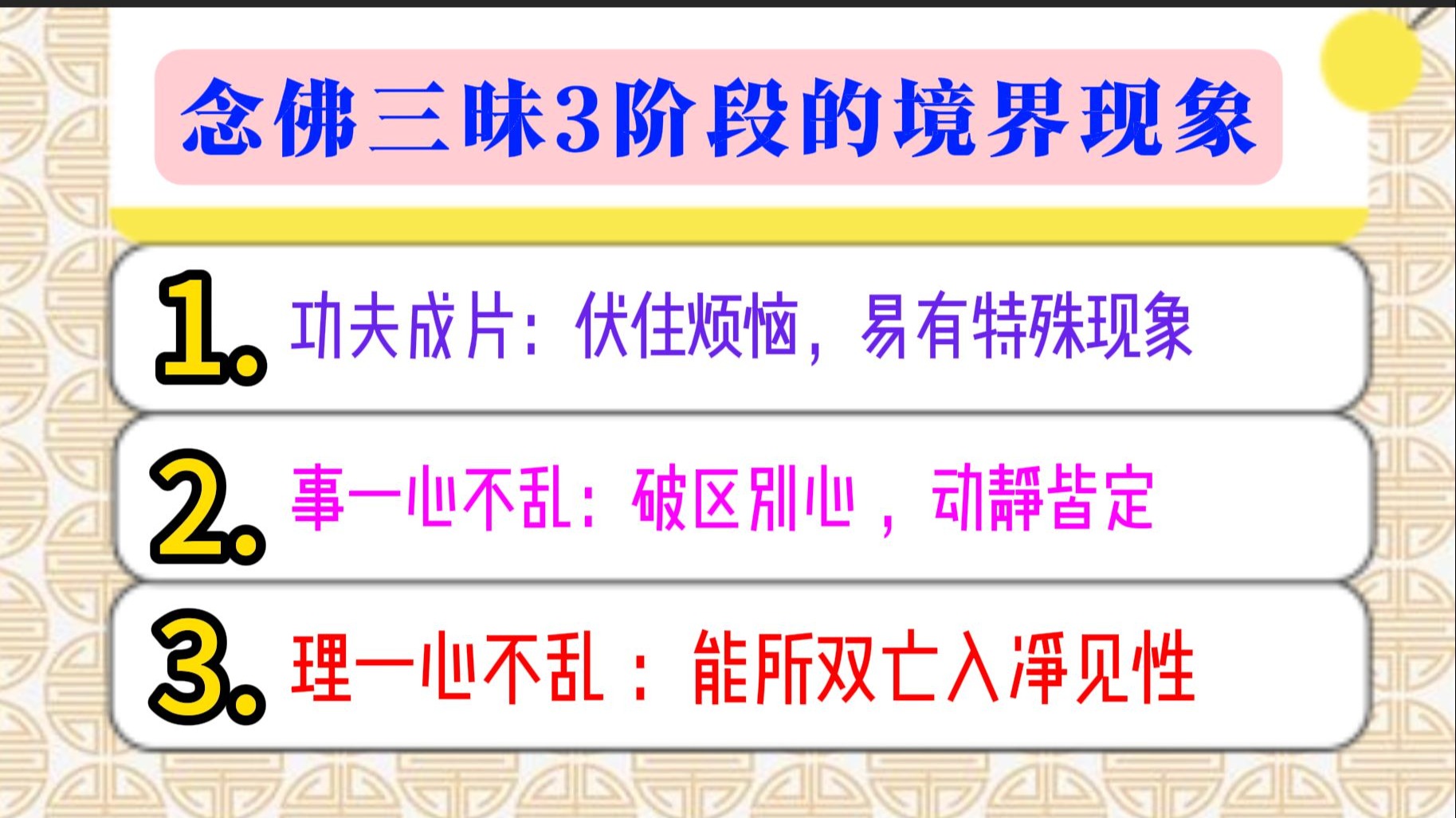 3-念佛三昧的3个阶段-对应的境界现象:功夫成片-事一心不乱-理一心不乱