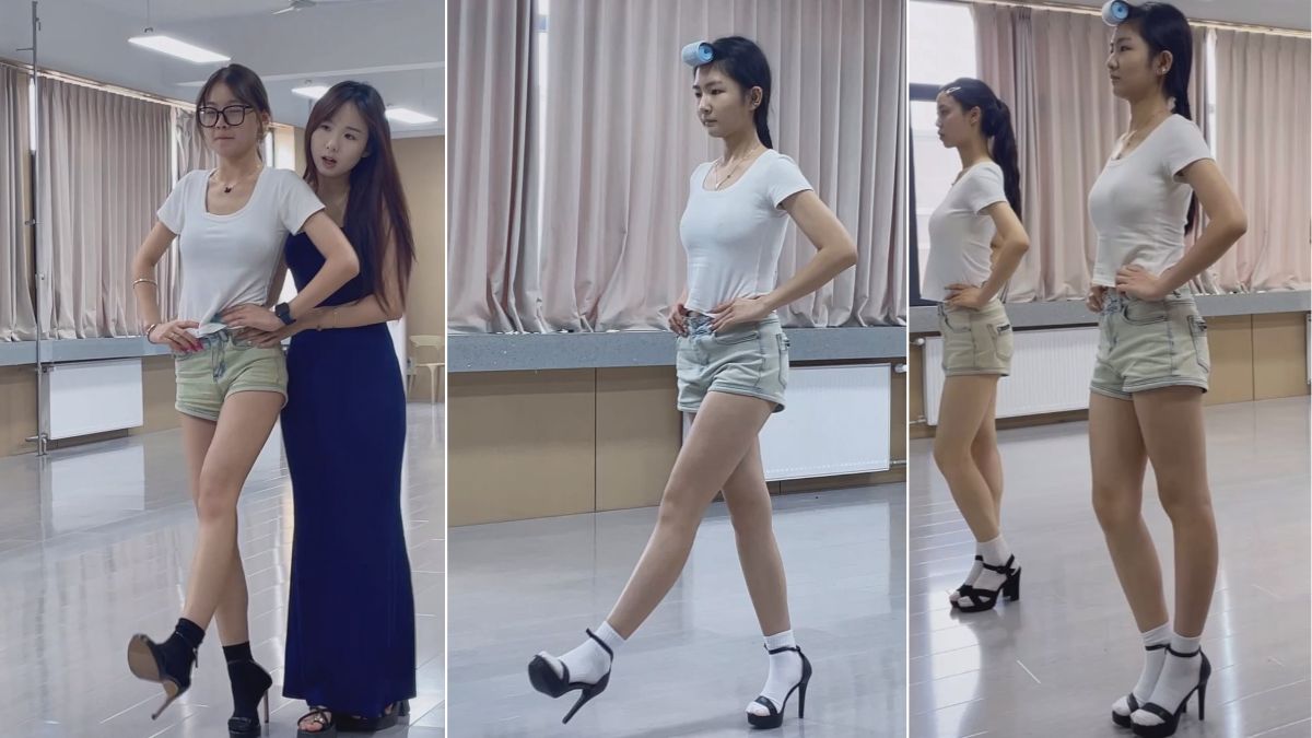 服表生穿袜子+高跟鞋训练 保护脚部 老师耐心指导动作