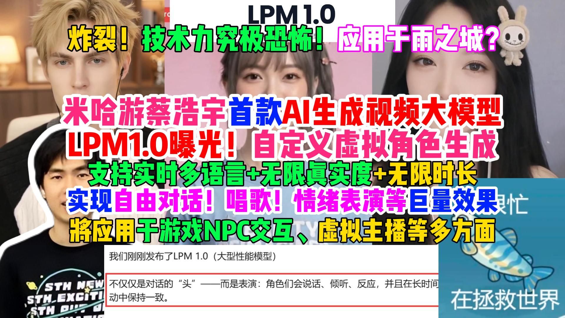 视频选集 炸裂!技术力究极恐怖!米哈游蔡浩宇首款AI生成视频大模型LPM1.0曝光!自定义虚拟角色?支持多语言+无限真实+无限时长,实现自由对话、唱歌、表演等效果 实时双语对话、讨论原神等游戏、歌唱、情绪表演、肢体动作演示部分 LPM1.0应用于虚拟主播效果展示 LPM1.0英文男虚拟主播 LPM1.0中文男虚拟主播 LPM1.0使用多种情绪生成不同视频的演示效果10分钟完整版 45分钟超长双工实时对话,LPM1.0演示