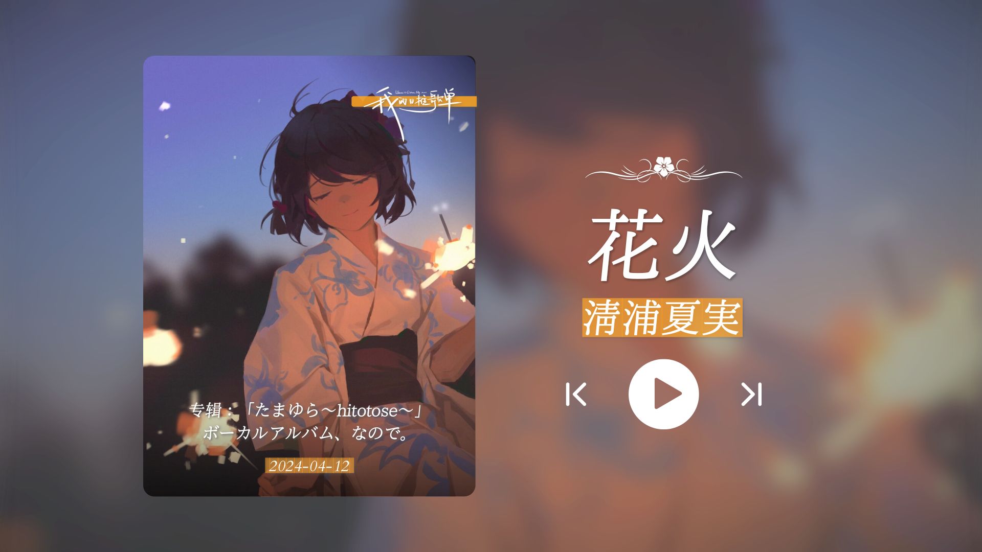 UP主: 封面: 简介:歌曲:花火歌手:清浦夏実链接:https://music.163.com/#/song?id=4920727仅用于个人学习交流,如有侵权请联系删除。背景图片:来源于 pixiv 网站图片链接:www.pixiv.net/...