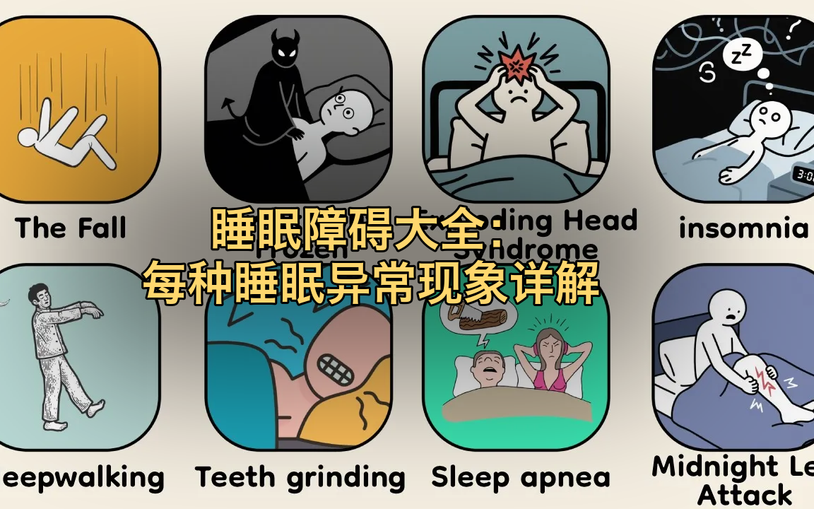UP主: 封面: 简介:原标题: Every Sleep Glitch Explained来源: https://www.youtube.com/watch?v=zXG0uDkJtPY本文系统性地介绍了多种睡眠障碍现象及其生理机制。核心概念包括入睡抽动(hypni...